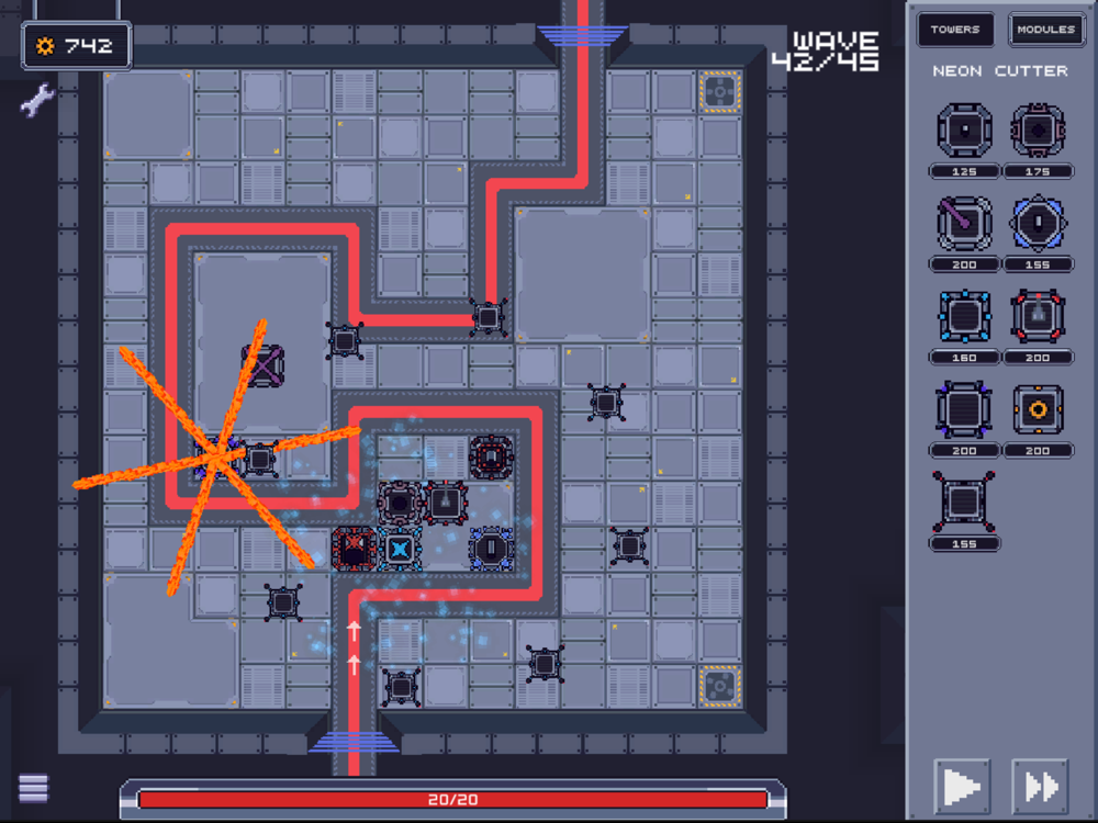 In Defendron, you must strategically place and upgrade a variety of towers to fend off the waves of enemies that move through the city. Each tower has unique abilities and playstyle, which can be altered or enhanced by the modules you mount.