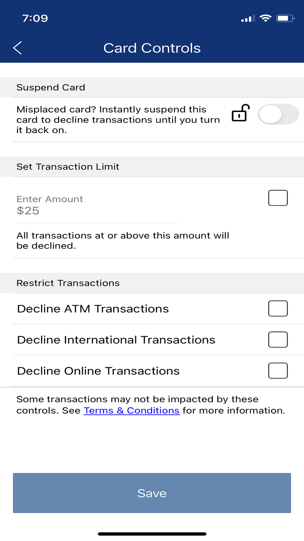 1st United Card Controls Features: