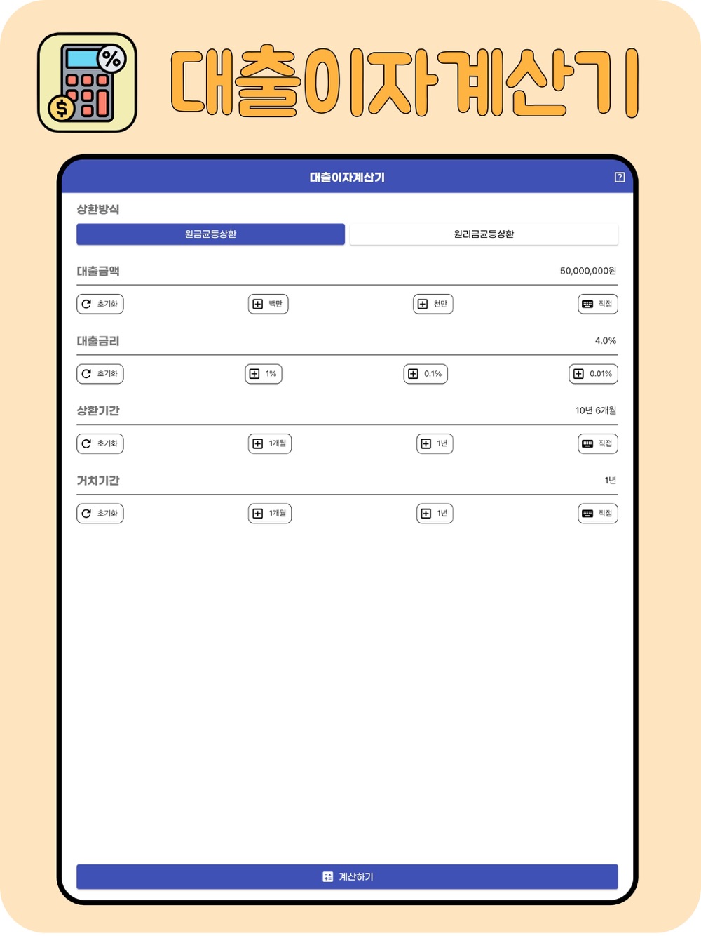 대출이자계산기는 대출종류(원금균등상환, 원리금균등상환), 대출금액, 대출금리, 상환기간, 거치기간을