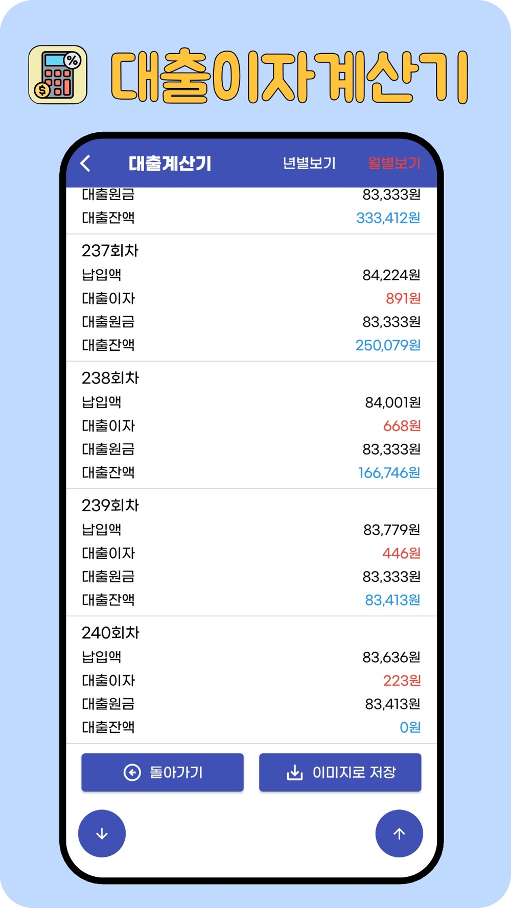 - 파일 및 미디어 : 대출 결과(납입액, 이자, 원금, 대출잔액)의 요약본과 세부사항을 이미지로 갤러리에 저장
