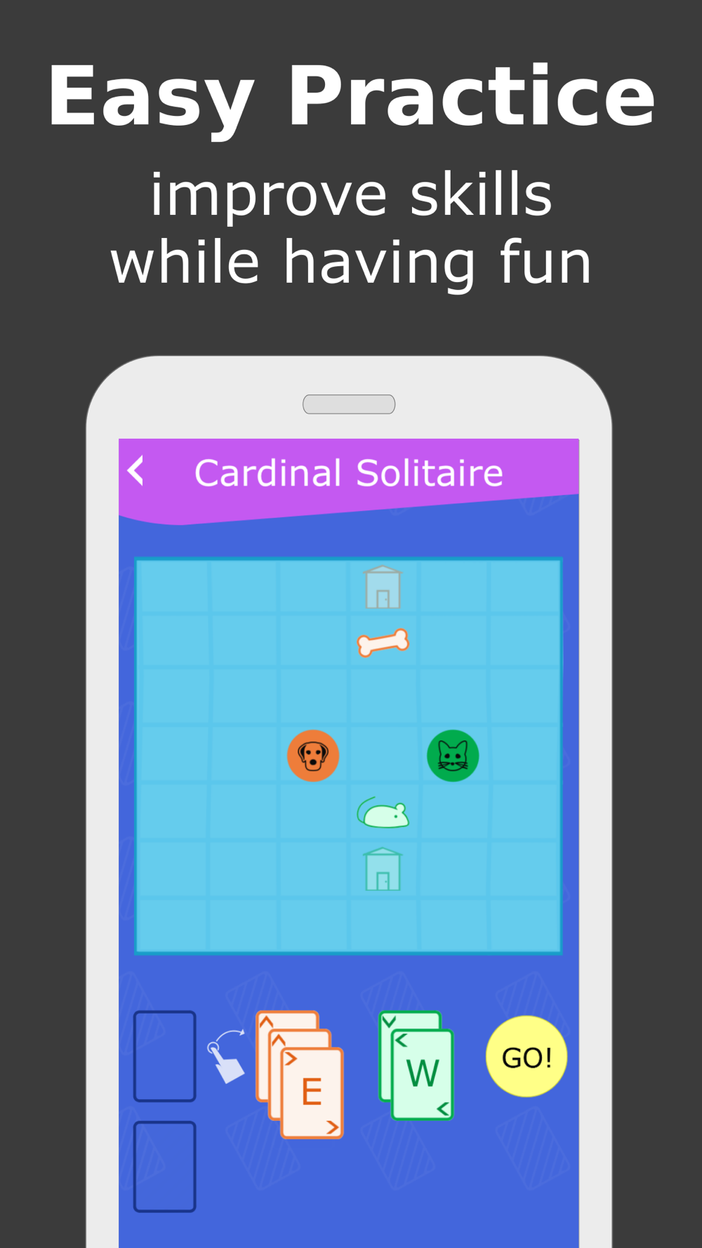 Cardinal directions refer to the four main directions shown on a map - north, east, south, and west. In this game, the objective is to use cardinal directions to help the character bring their item back to their home. As the character moves across the grid in one of the four cardinal directions, North (up), South (down), East (right), or West (left) the character bumps the item moving it in the characters' current direction.