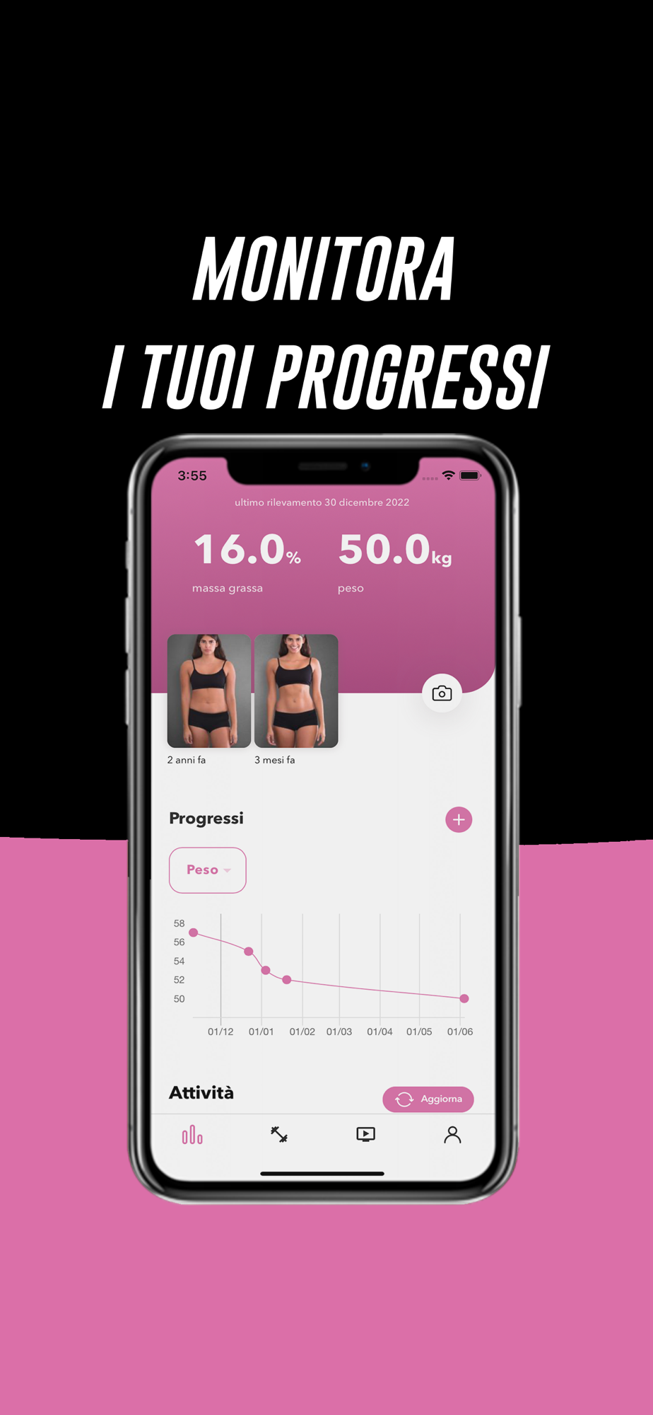 Avrai sempre sotto controllo la tua attività fisica: potrai visualizzare quali esercizi sono previsti nel tuo piano di allenamento, i tuoi progressi e come cambia il tuo fisico nel corso del tempo.