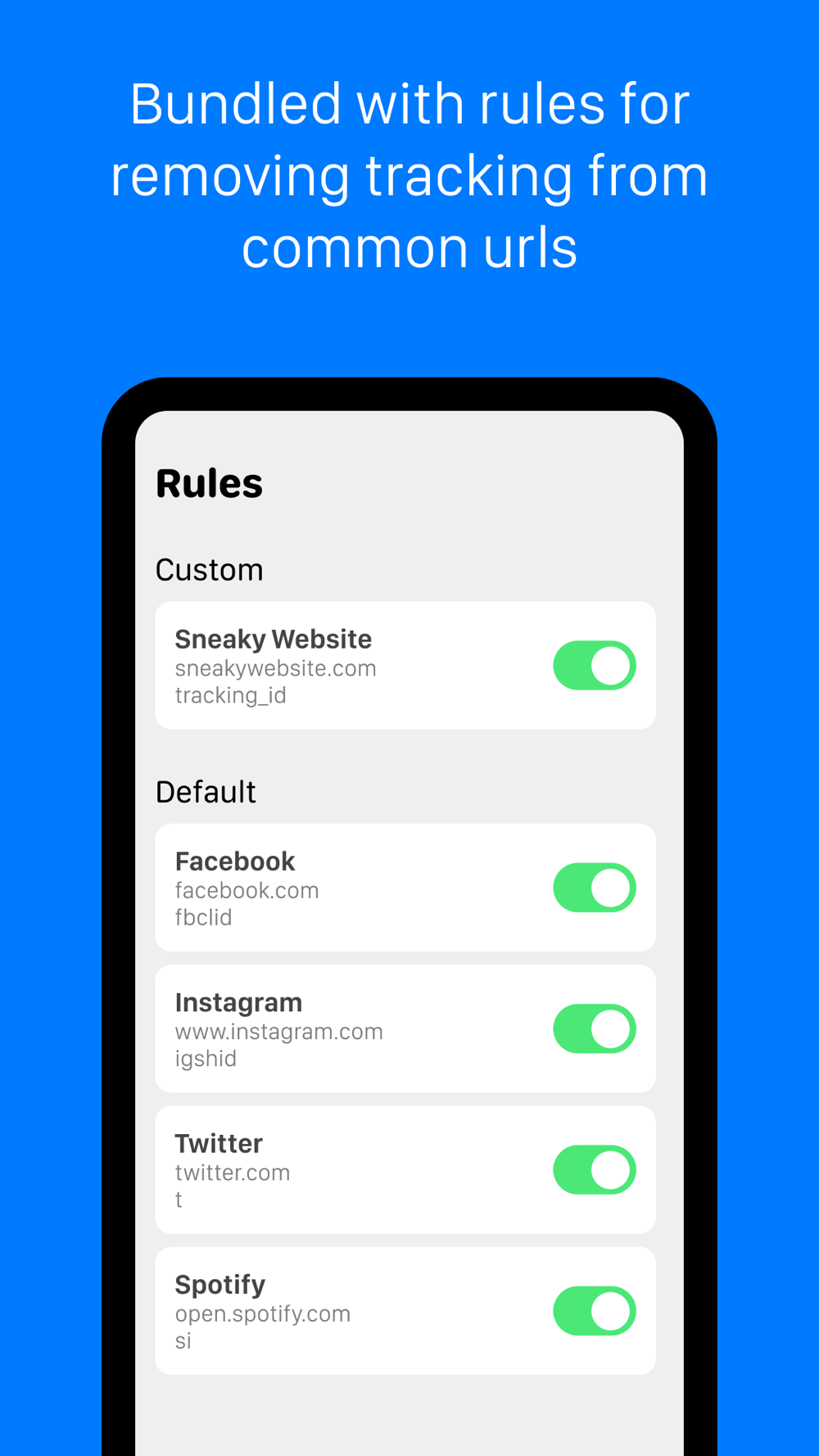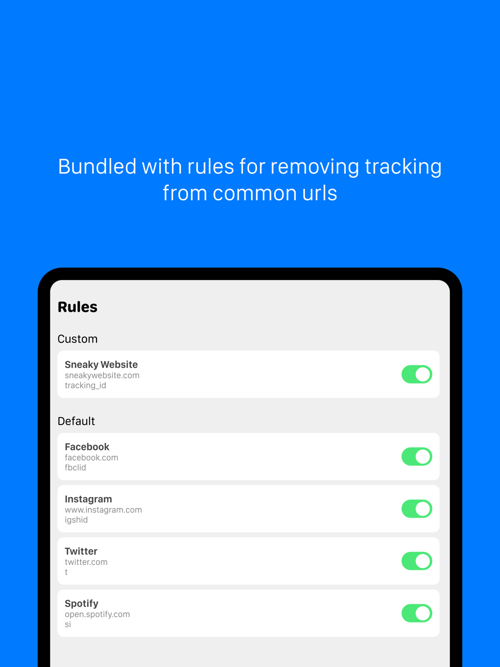 PRELOADED RULES: Clean Share comes bundled with a comprehensive set of rules designed to remove tracking elements from popular URLs, making it easier than ever to share without compromising your privacy.