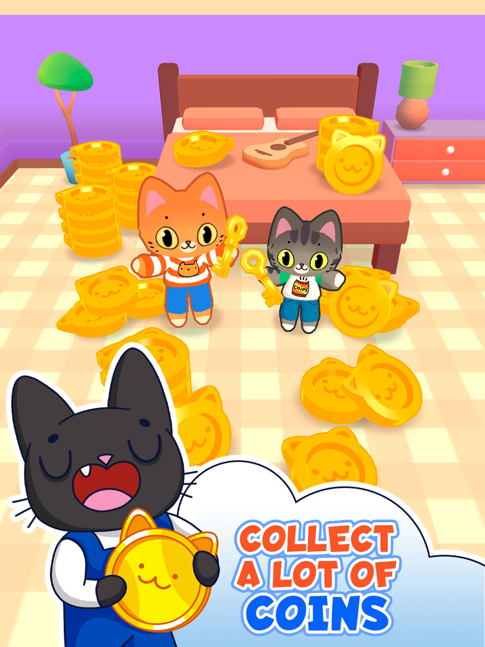 In the first mode, you will play as the cat Simba. Your task is to hide in the house wearing an object. But be careful, the owner Artem will be looking for you to take pictures with his phone. If he finds you and takes a photo, the game will be lost. Collect coins and keys to unlock new costumes and decorations.