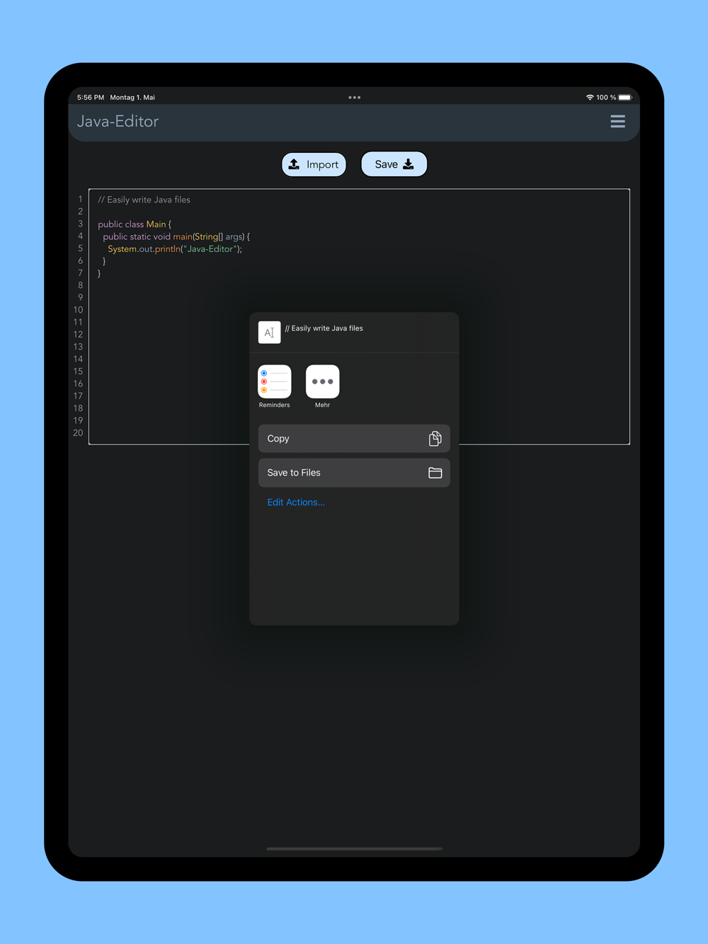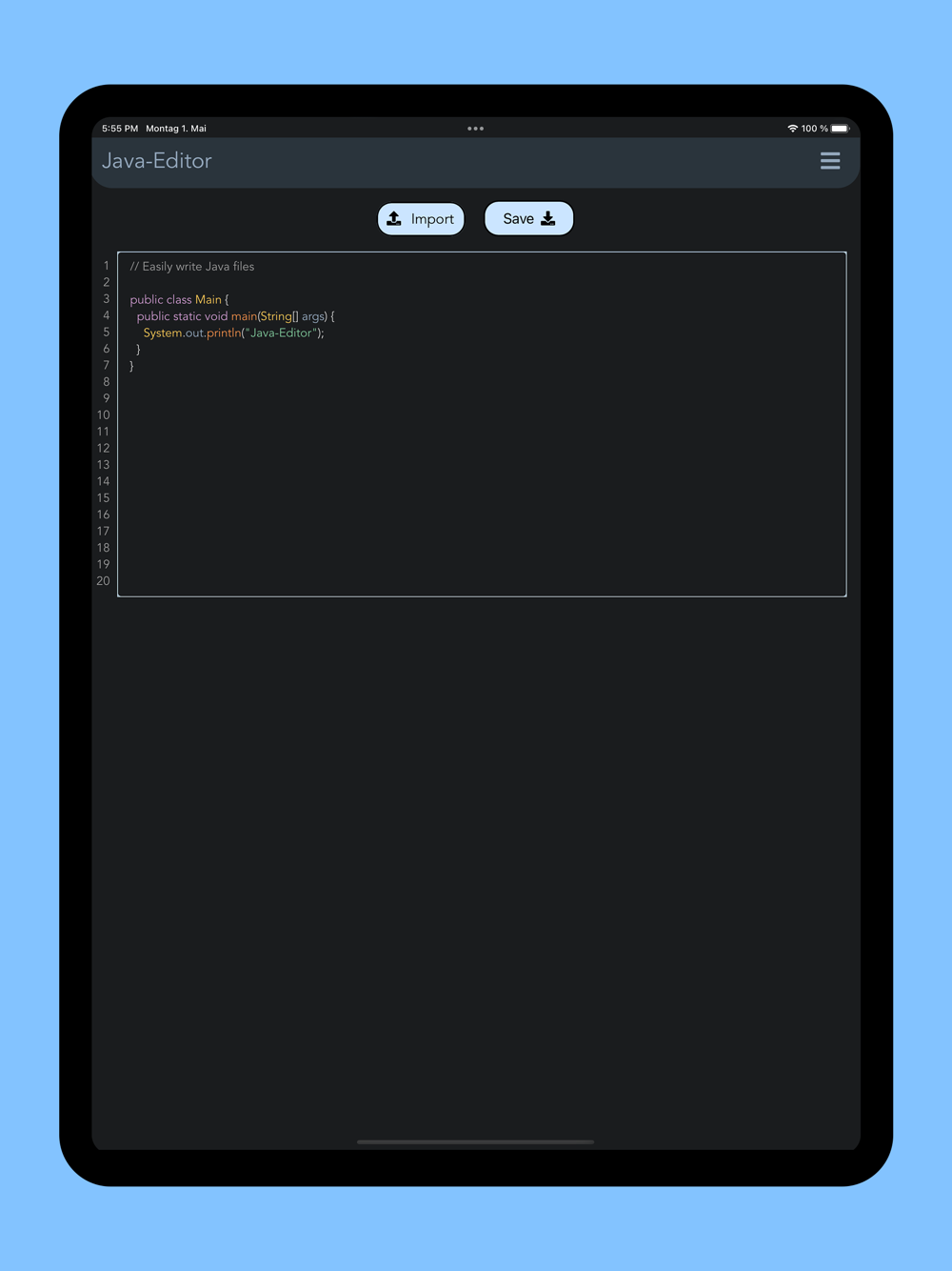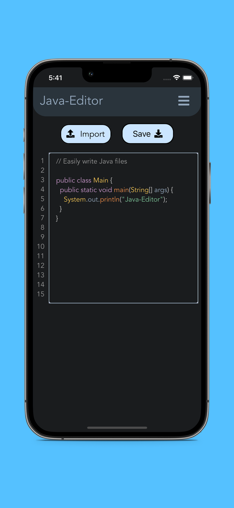 Java Editor is a simple and powerful app for creating, editing, and saving Java files on your device. With its intuitive interface and essential features such as import and export and syntax highlighting, Java Editor is the perfect tool for anyone who needs to manage their Java code. Whether you're a student, developer or just need to write or view some code, Java Editor makes it easy to write Java code on-the-go or at home. Download Java Editor now and experience the power of effortless Java editing!