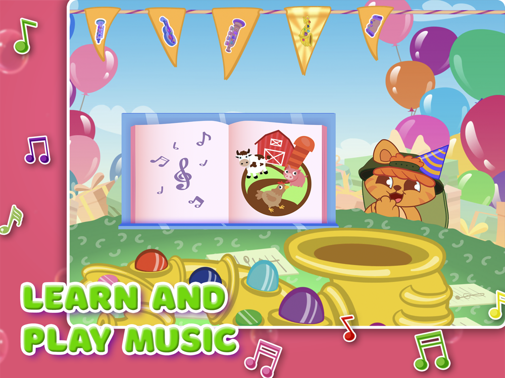 - Explore a variety of musical instruments, including piano, xylophone, trumpet, flute, violin, guitar, drums, saxophone, and accordion.