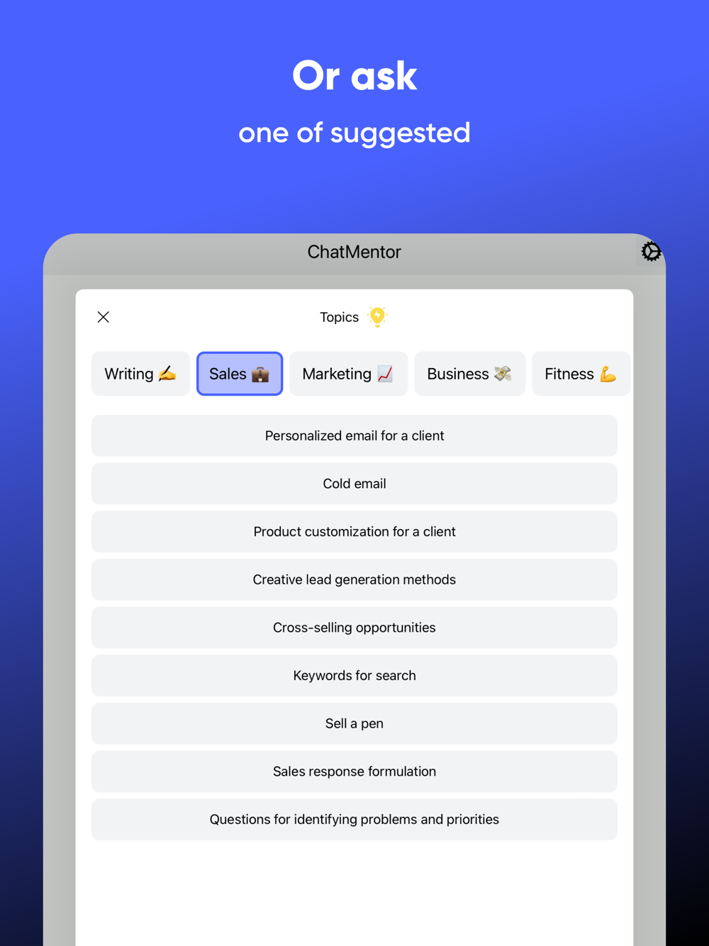 Personal and Professional Prompts: Whether you're a creative professional or just looking for some personal motivation, ChatMentor offers a diverse range of prompts to spark your imagination and boost productivity.