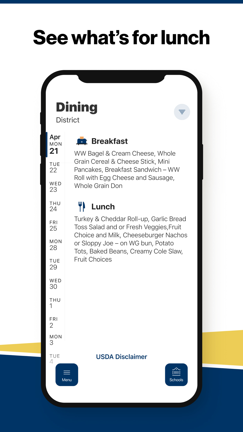 Within the dining section, you’ll find an easy to navigate, weekly menu, sorted by day and meal type.