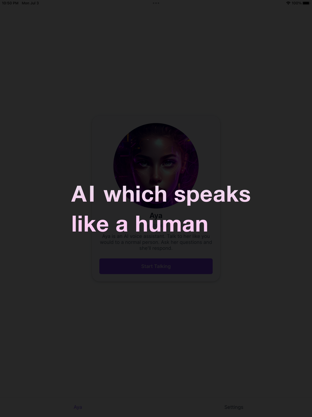 It's a next generation AI assistant powered by ChatGPT API. Aya can answer all sorts of questions. Instead of texting, use your voice to communicate with AI.
