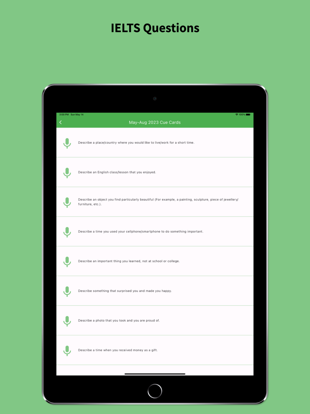 Basically, The application provides mock samples to practice for the IELTS and CELPIP Speaking modules where test-takers can practice along with recording their audio on the device and playback to listen and analyze how they did.
