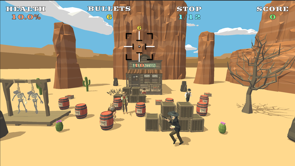 Being an honorable sheriff, your objective is to only disarm the bad guys and destroy the TNT cache.