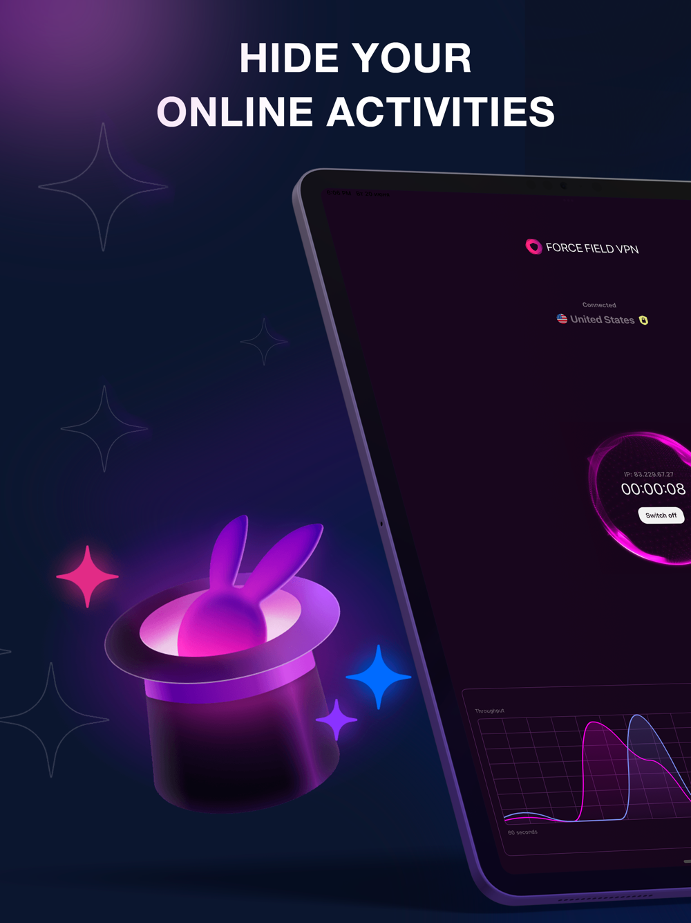 Complete end-to-end data encryption protects your device from hackers, malware, black ads, like a force field, that's why the VPN bears this name. Even your ISPs or special services cannot access your data such as your browsing history, messages or files.