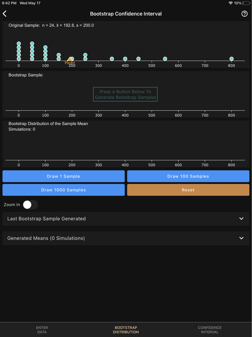 Easily find the bootstrap confidence interval based on the percentile method, standard error method, and compare it to what you would get with the traditional formulas.