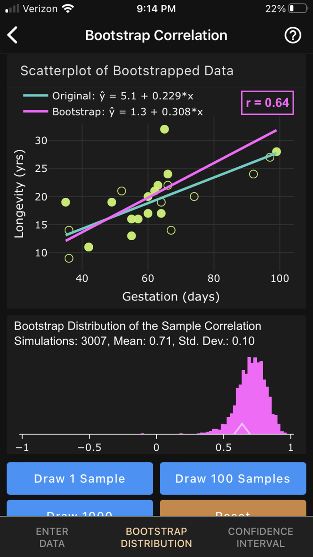 This statistical calculator lets you create and visualize the bootstrap distribution for means, medians, correlations, slopes and other parameters.