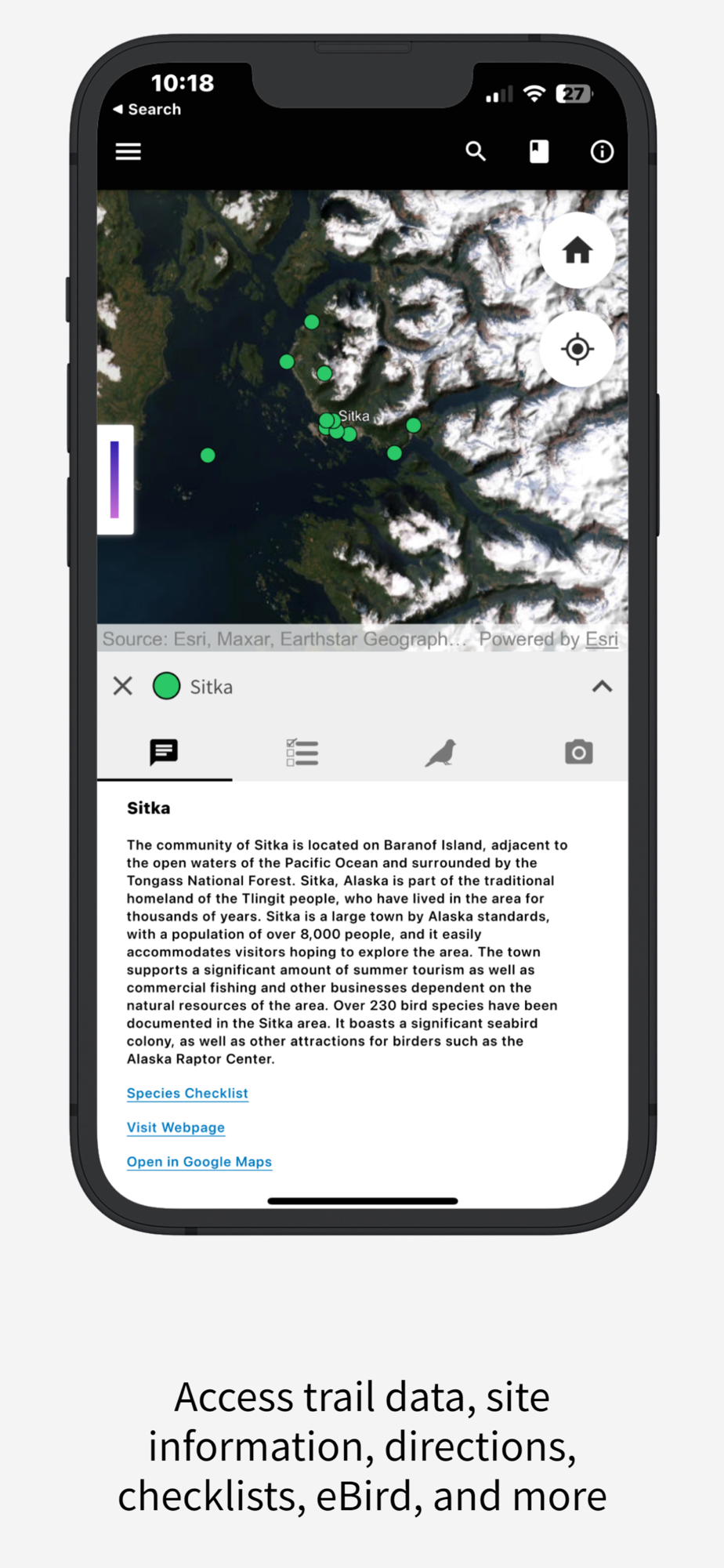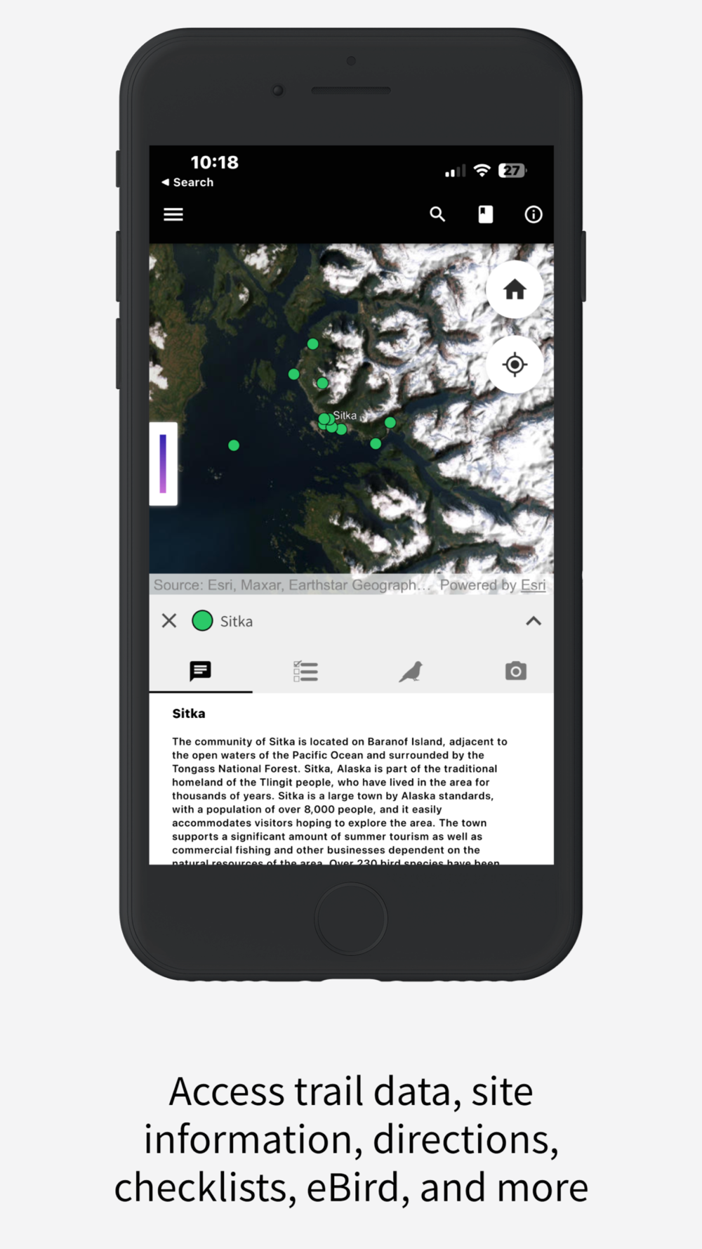 The Southeast Alaska Birding Trail is a curated list of nearly 200 sites and 18 communities across the Alaska panhandle where visitors can see diverse species, landscapes, and ecosystems. The Southeast Alaska Birding Trail mobile application allows you to explore everything the trail has to offer conveniently from your mobile device. When you first open the app, you’ll be prompted to download the mobile map package, which makes maps, site details and directions, species checklists, and more available wherever you go, regardless of whether you’re connected to the internet. Download once, access forever.