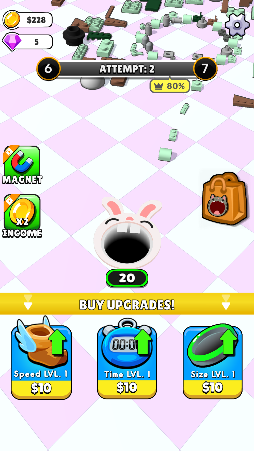 With the money you earn from gathering bricks, you can invest in exciting upgrades before starting a new round. Increase the hole size, enhance its movement speed, or even extend the timer, giving you more time to collect bricks and complete levels.