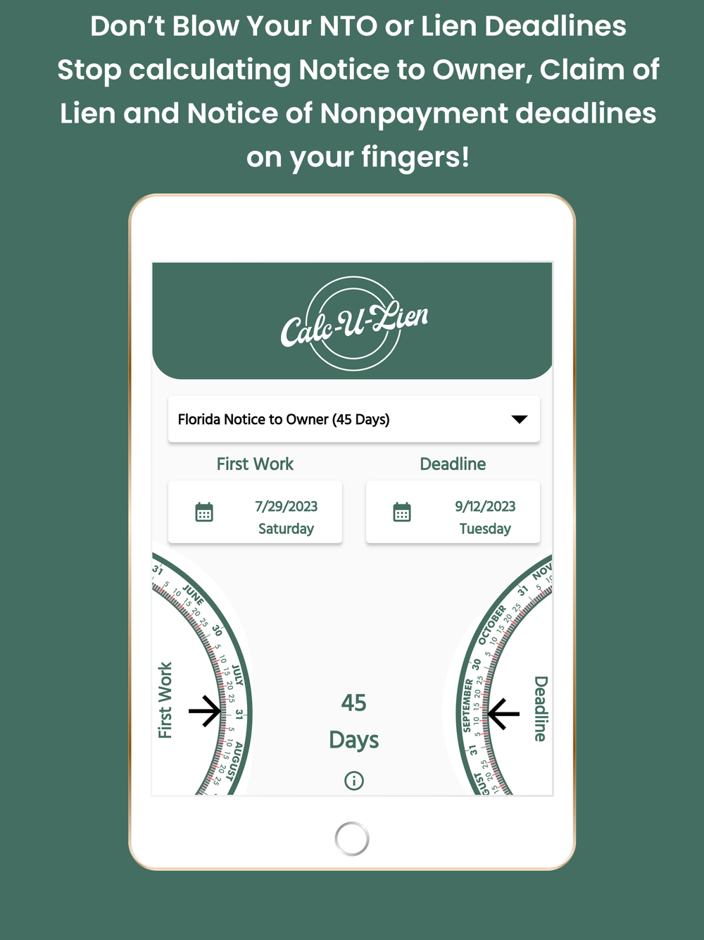 1. Calc-u-Lien: No more deadline stress! Enter your contract details into Calc-u-Lien, and we'll provide precise due dates for your Notice to Owner (NTO), Claim of Lien, or Payment Bond Claim/Notice of Nonpayment.
