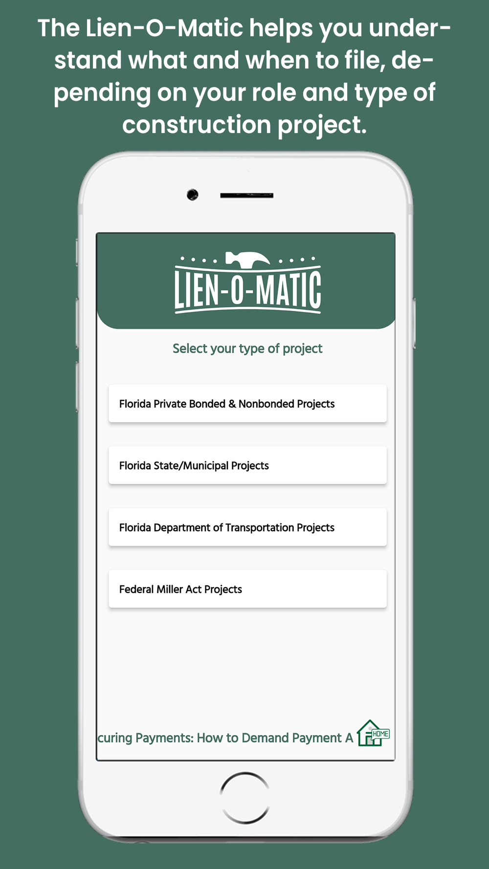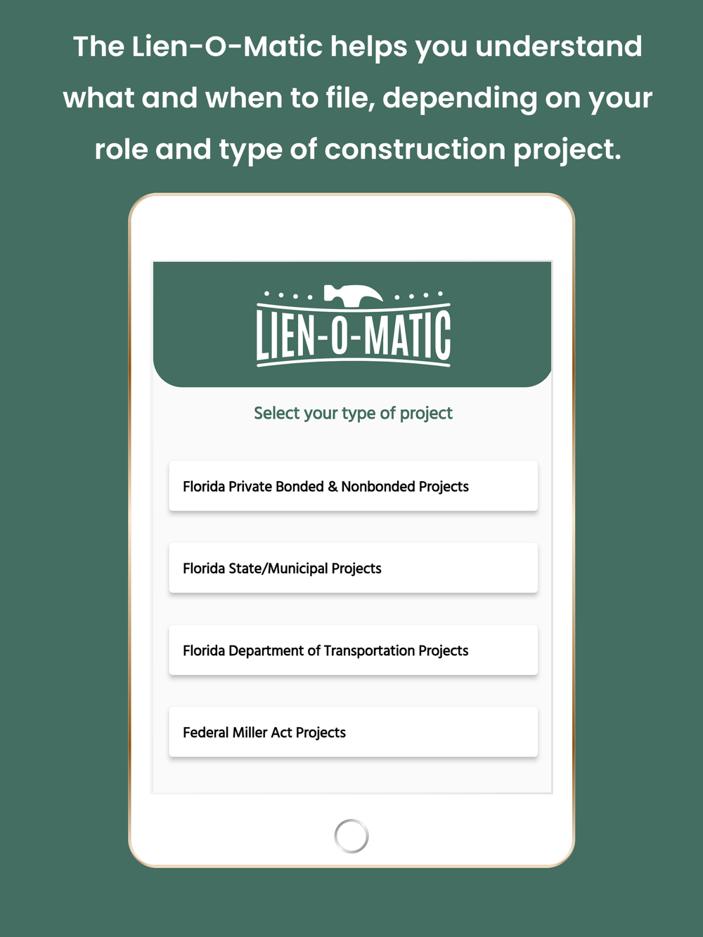 2. Lien-o-Matic: Get clarity on what to file and when to secure your rights. Based on your project type and role (GC, sub or supplier), Lien-o-Matic provides detailed information, covering private, public, Federal, and FDOT projects, ensuring you fulfill your responsibilities on time.