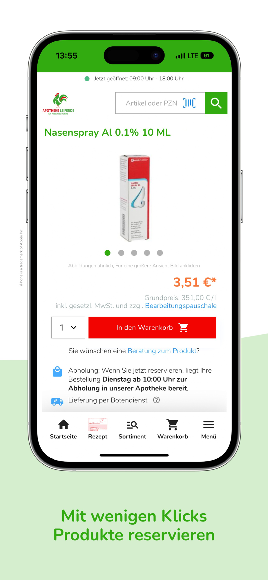 Wir bieten Ihnen über die App unser gesamtes Sortiment. Nicht sofort verfügbare Produkte bestellen wir für Sie und machen Sie in der Regel bis zum nächsten Werktag abholbereit. Gerne liefern wir Ihnen Ihre Bestellung per Botendienst direkt nach Hause.
