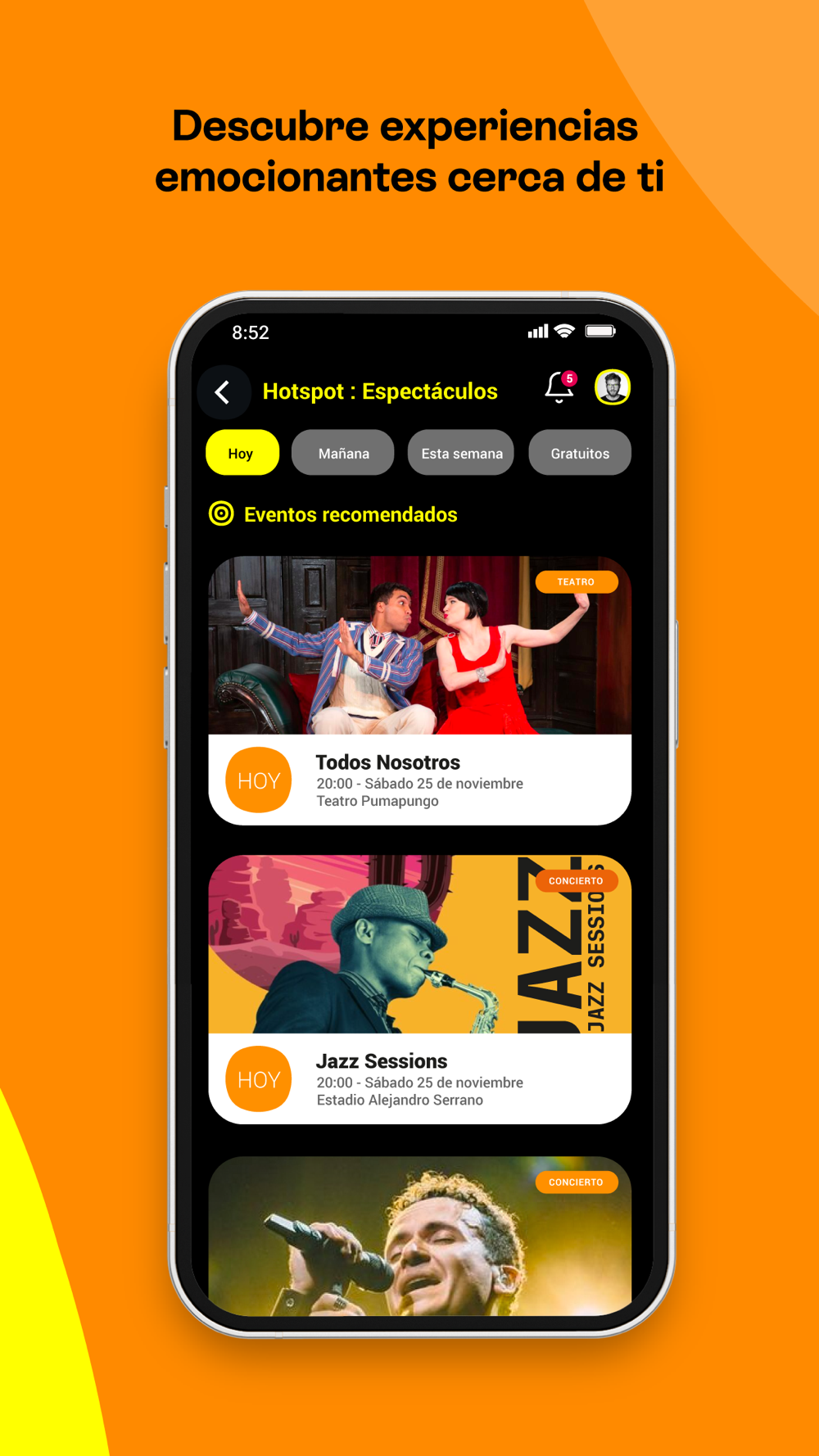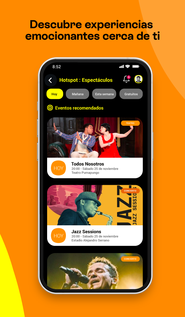 Encuentra eventos: Explora una amplia gama de eventos en tu área, desde conciertos y exposiciones hasta festivales y eventos deportivos. Contamos con diferentes categorías y filtros inteligentes para encontrar el lugar perfecto a donde ir.