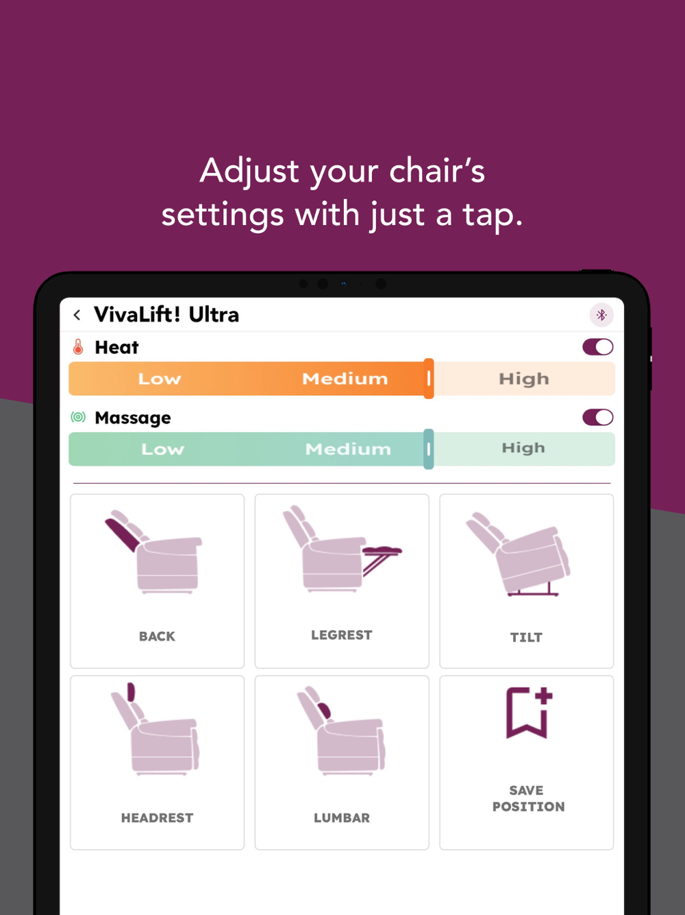VivaLift!® Power Recliners from Pride Mobility® offer the ultimate in style and performance. With the My VivaLift!® app, users can experience the luxury and comfort of our power recliners right from their smartphone or tablet. The app offers the same functionality of the hand controller that comes with each VivaLift! recliner, and more. Adjust the power headrest, backrest, and lumbar, increase or decrease the level of your heat and massage settings, lay flat with just one button, or reach a standing position with one button as well. Save up to five memory positions in the app and share your chair’s functionality with family, friends, and caregivers so that they may assist you in finding that perfect resting position. It’s never been easier to kick back and unwind. The My VivaLift! app is designed with your convenience in mind, to help you experience all that VivaLift! has to offer.