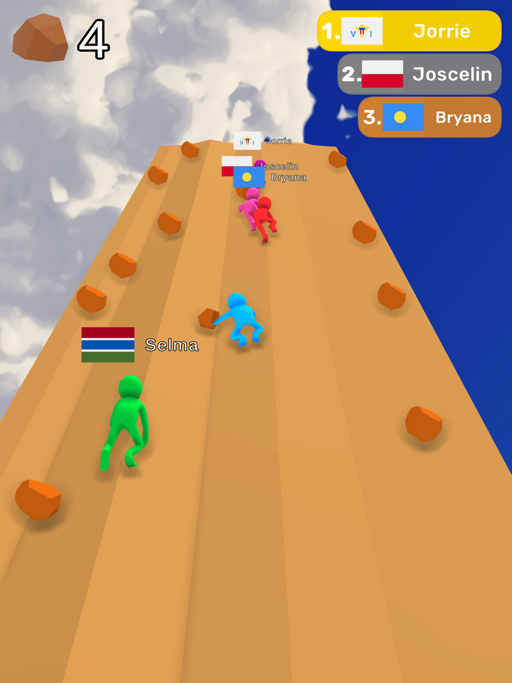 Introducing "Cliff Climb Royale," the ultimate hyper-casual mobile game that will test your agility, strategy, and reflexes! Embark on a thrilling IO adventure where you must race against other players to be the first to conquer the treacherous mountain peak. Dodge the relentless barrage of falling rocks, collect rocks of your own, and strategically hurl them at your rivals to knock them off the cliff, leaving you as the sole victor.