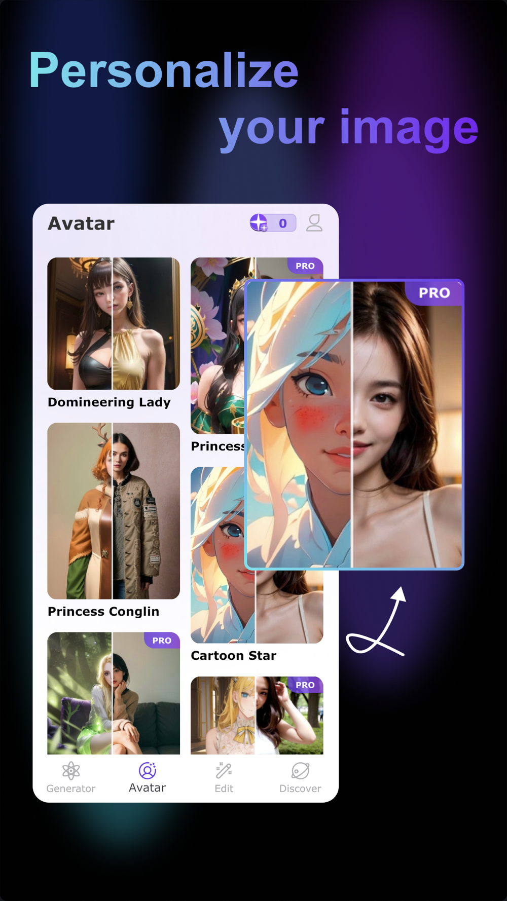 Harness the power of our state-of-the-art AI technology and professional avatar models to effortlessly transform your images into stunning AI photos. With the variety of options available in our app, we guarantee you'll get results you'd never expected.