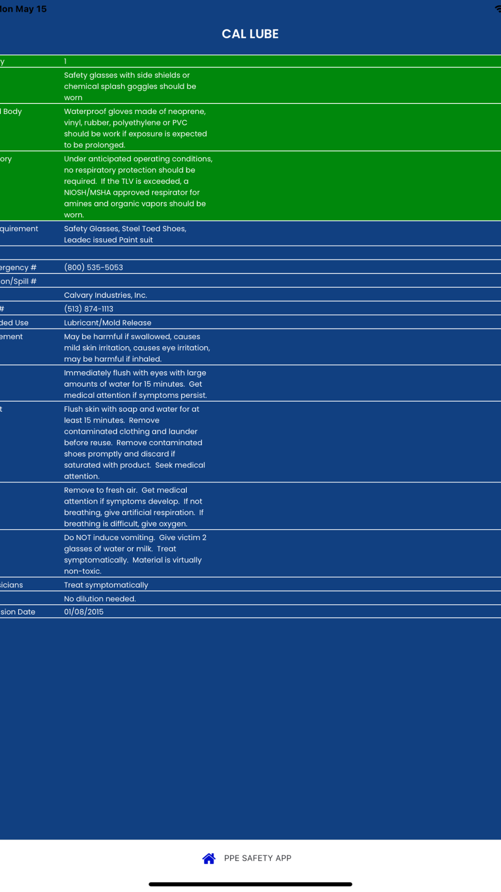 The PPE Safety App identifies the PPE requirements for specific chemicals and what to do if you come in contact with the chemical. Emergency contact numbers are provided, coloring to identify the toxicity of the chemical, note for the Doctor if you seek treatment & more!