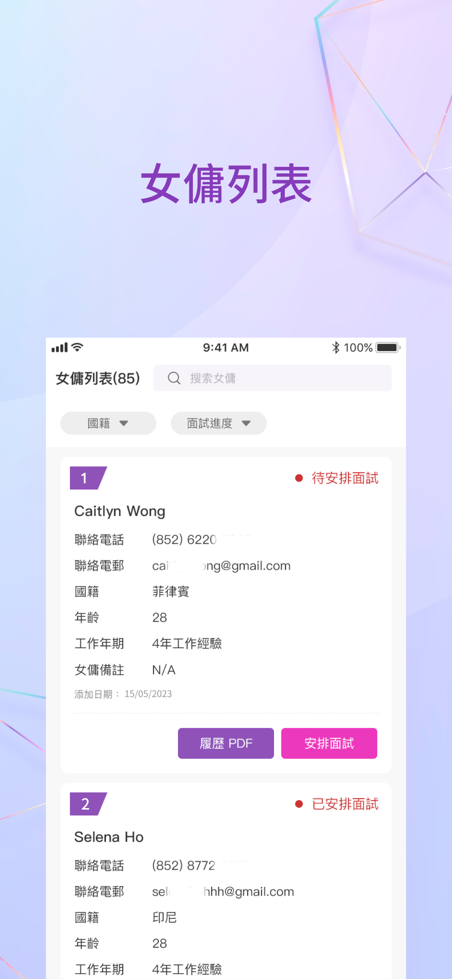 Through our app, you can easily manage customer information and domestic helper profiles, efficiently schedule interviews, and perform data analysis to optimize operations. Accessing your account information and staying updated on business dynamics is also effortless. Our management app will help you enhance business efficiency and provide superior service.