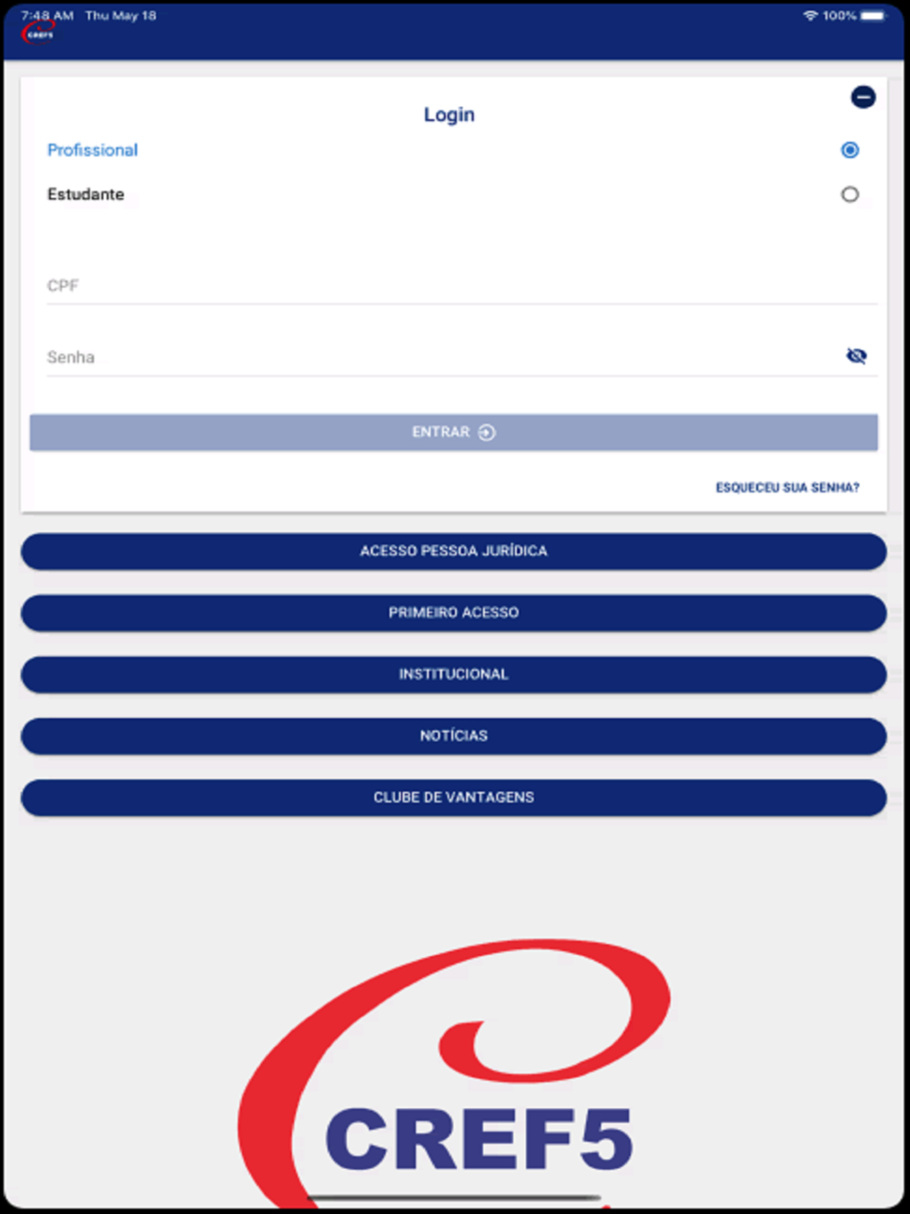 Aplicativo do CREF5/CE contendo notícias do conselho, a possibilidade de consultar e alterar dados cadastrais e realizar pagamento das anuidades do conselho.
