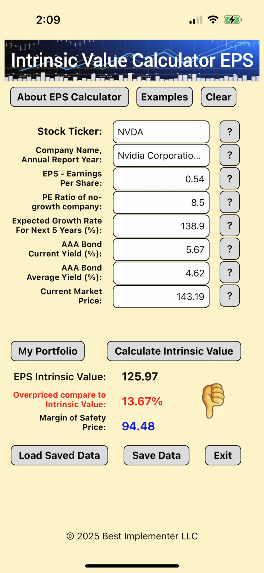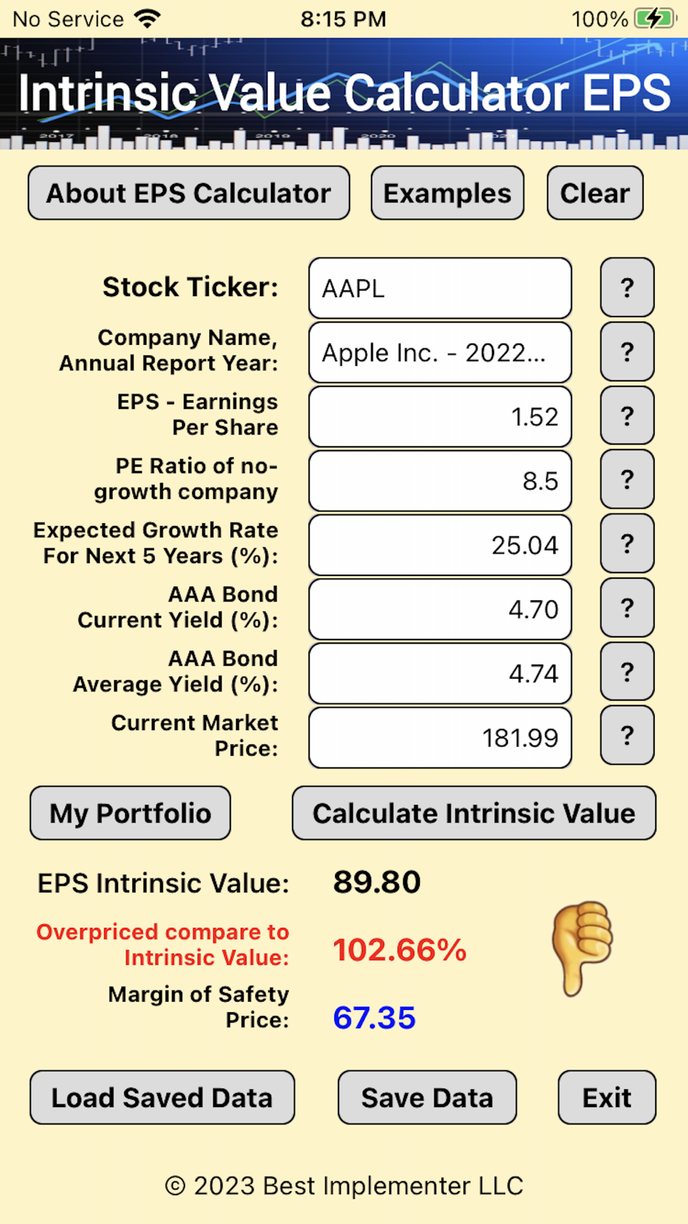 Following input parameters are required to calculate Intrinsic Value based on Benjamin Graham's EPS formula and to save data to your iPhone: