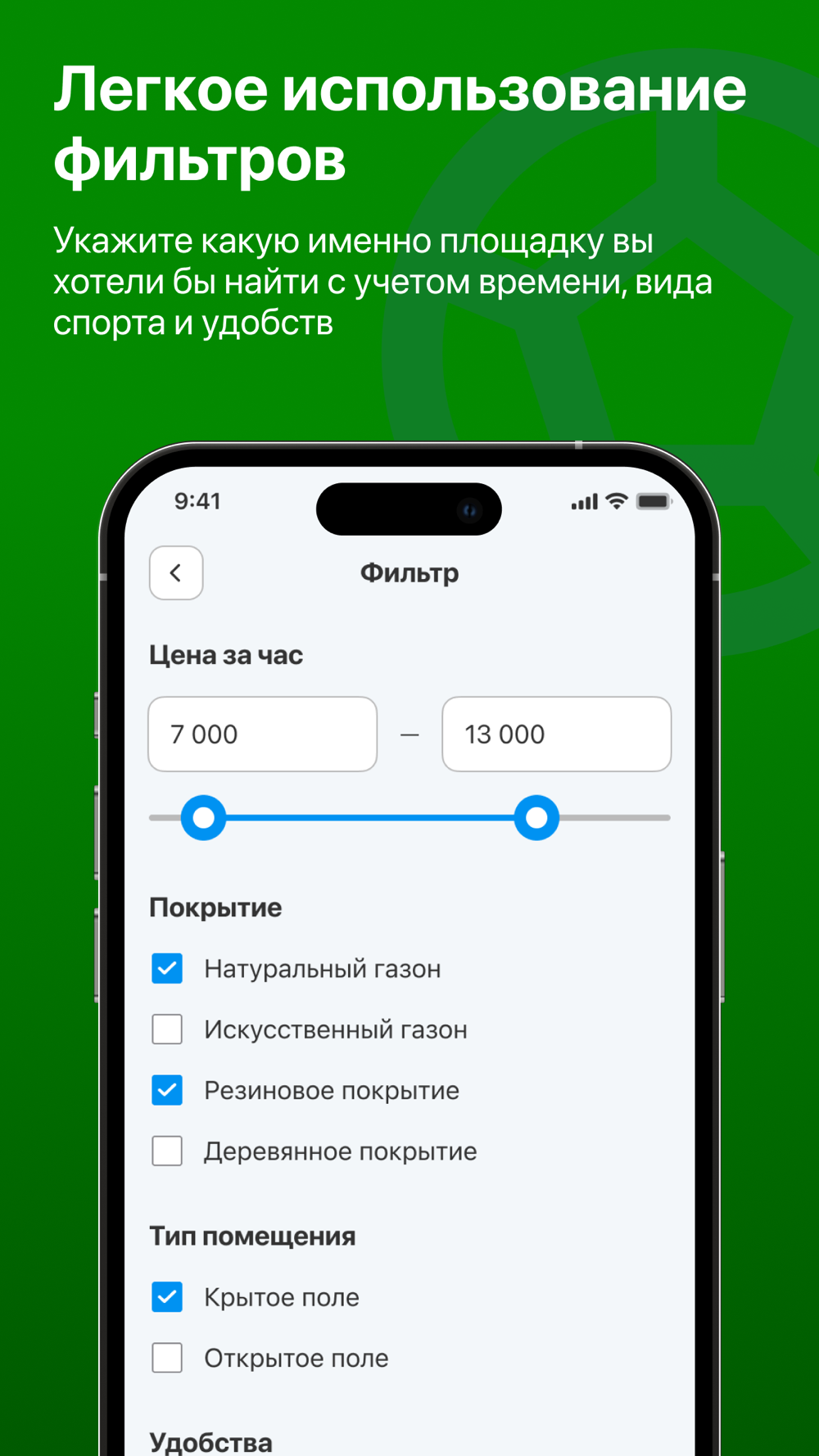 • Фильтры: Выбирайте площадки по виду спорта, городу, удобствам, времени и цене.