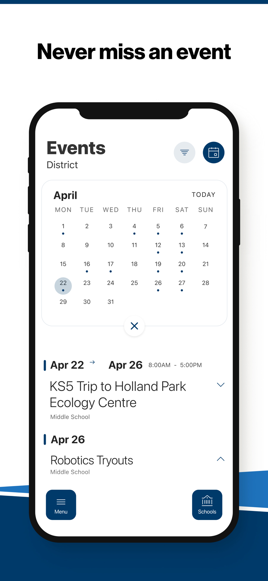 The event section shows a list of events throughout the district. Users can add an event to their calendar to share the event with friends and family with one tap.