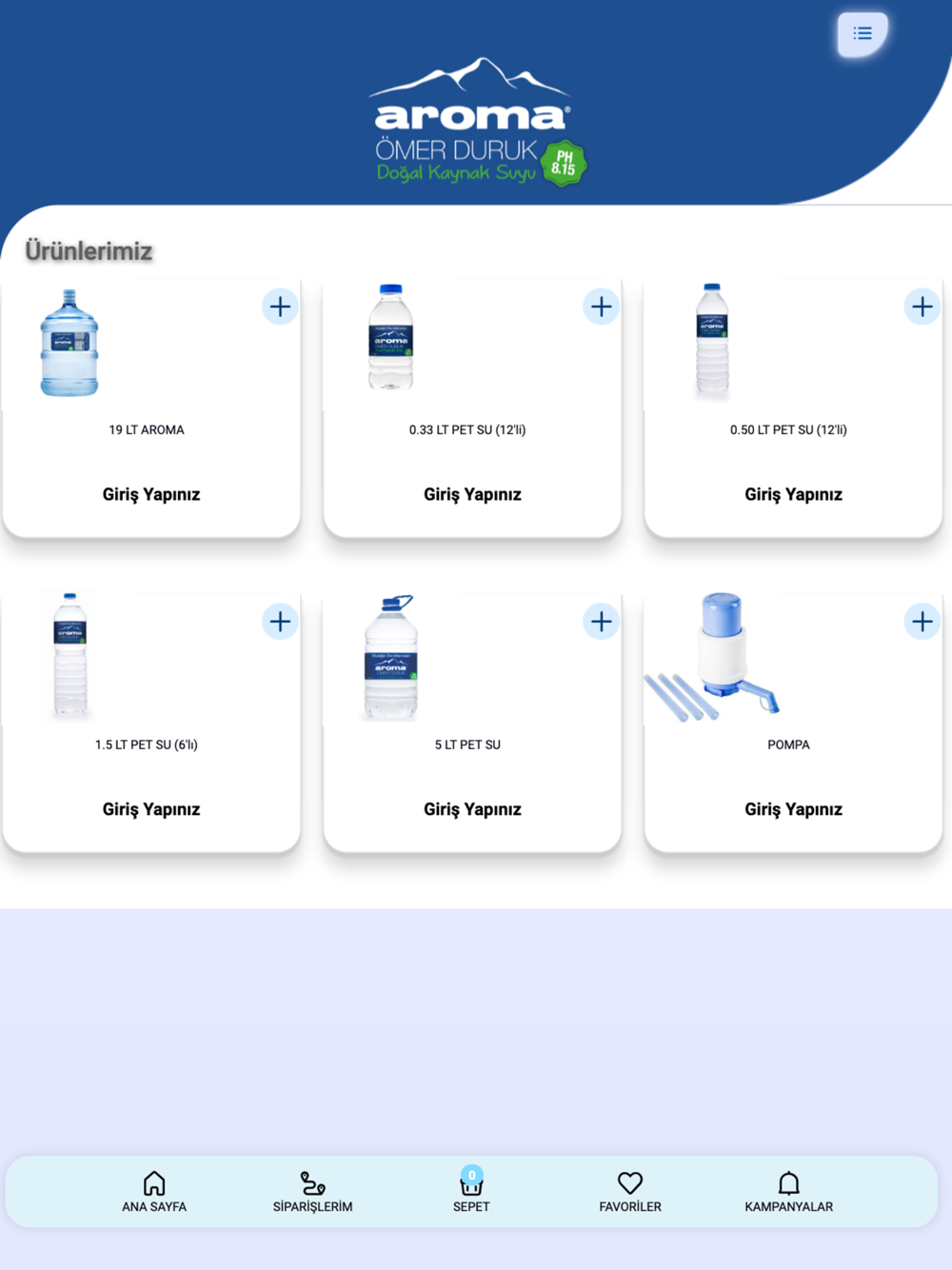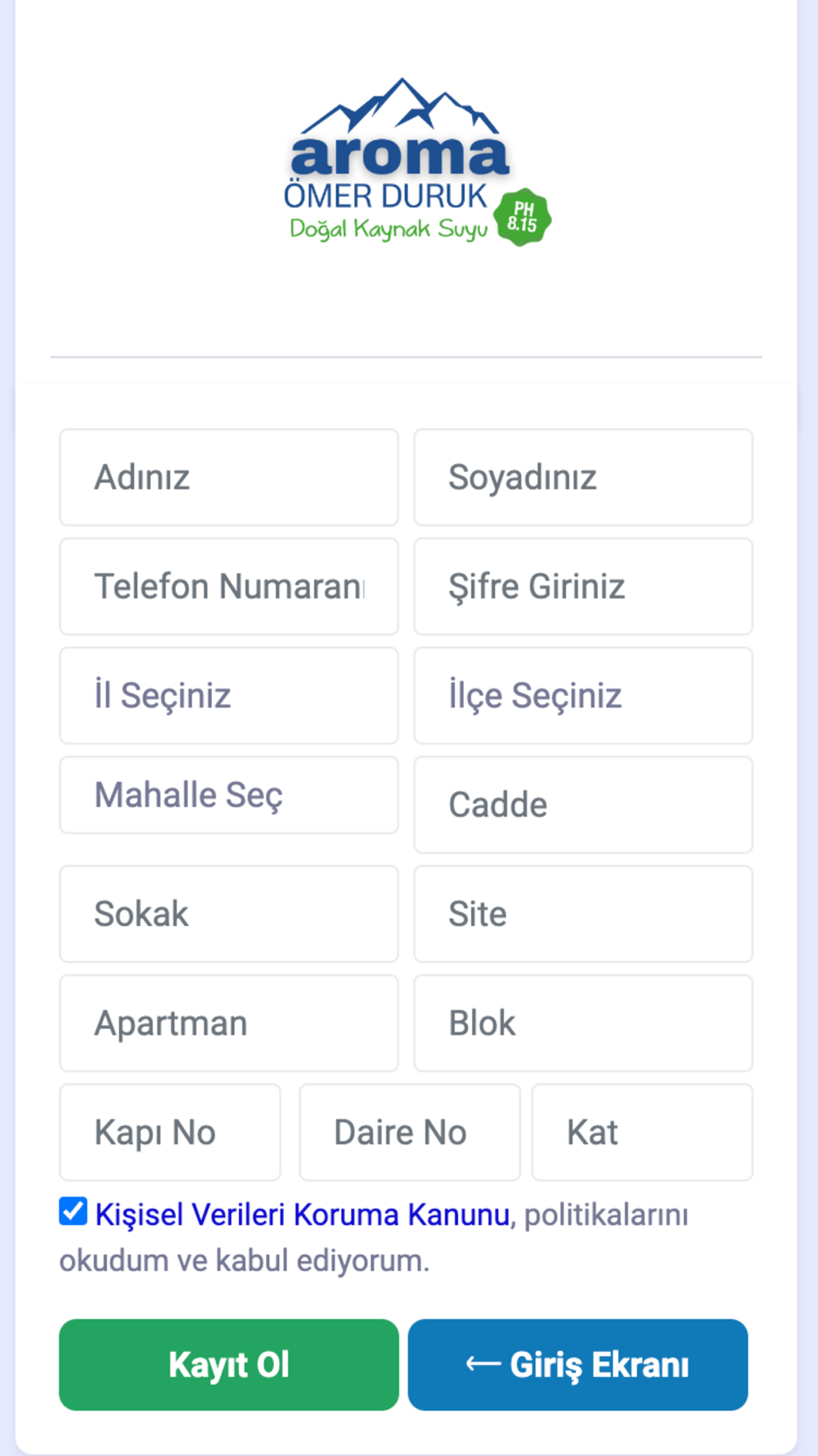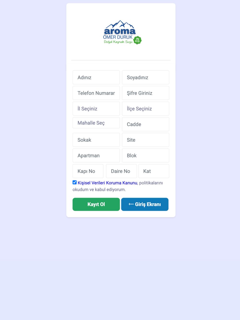 Aroma Su Mobil Sipariş Uygulaması ile sipariş vermek artık çok kolay! Damacana, Cam Damacana, Pet ve Bardak Su siparişlerinizi uygulamadan verebilir, kredi kartı ve kapıda nakit ile ödeme yapabilirsiniz.