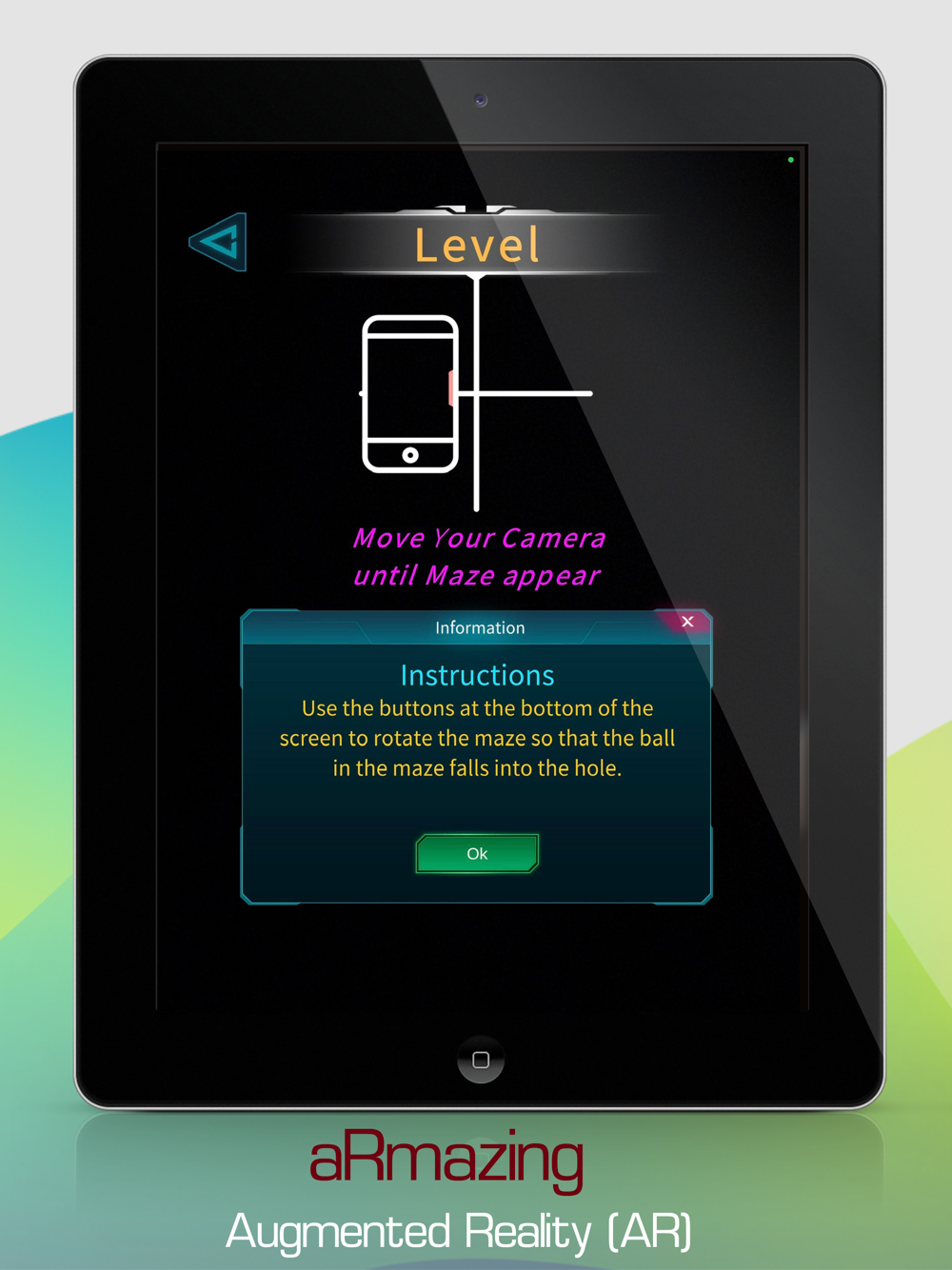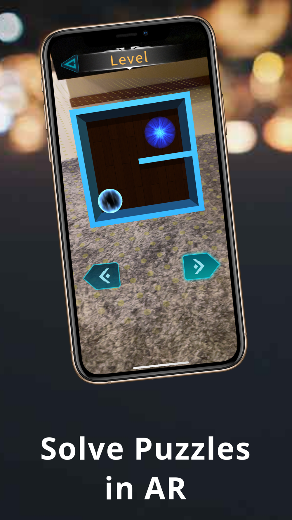 To place the Maze on a plane (flat horizontal surface) in augmented reality (AR), point the device's camera so that the center of the screen points to the plane selected by the player (e.g. a table). When detected by the app, these planes will appear on the screen as dotted surfaces.