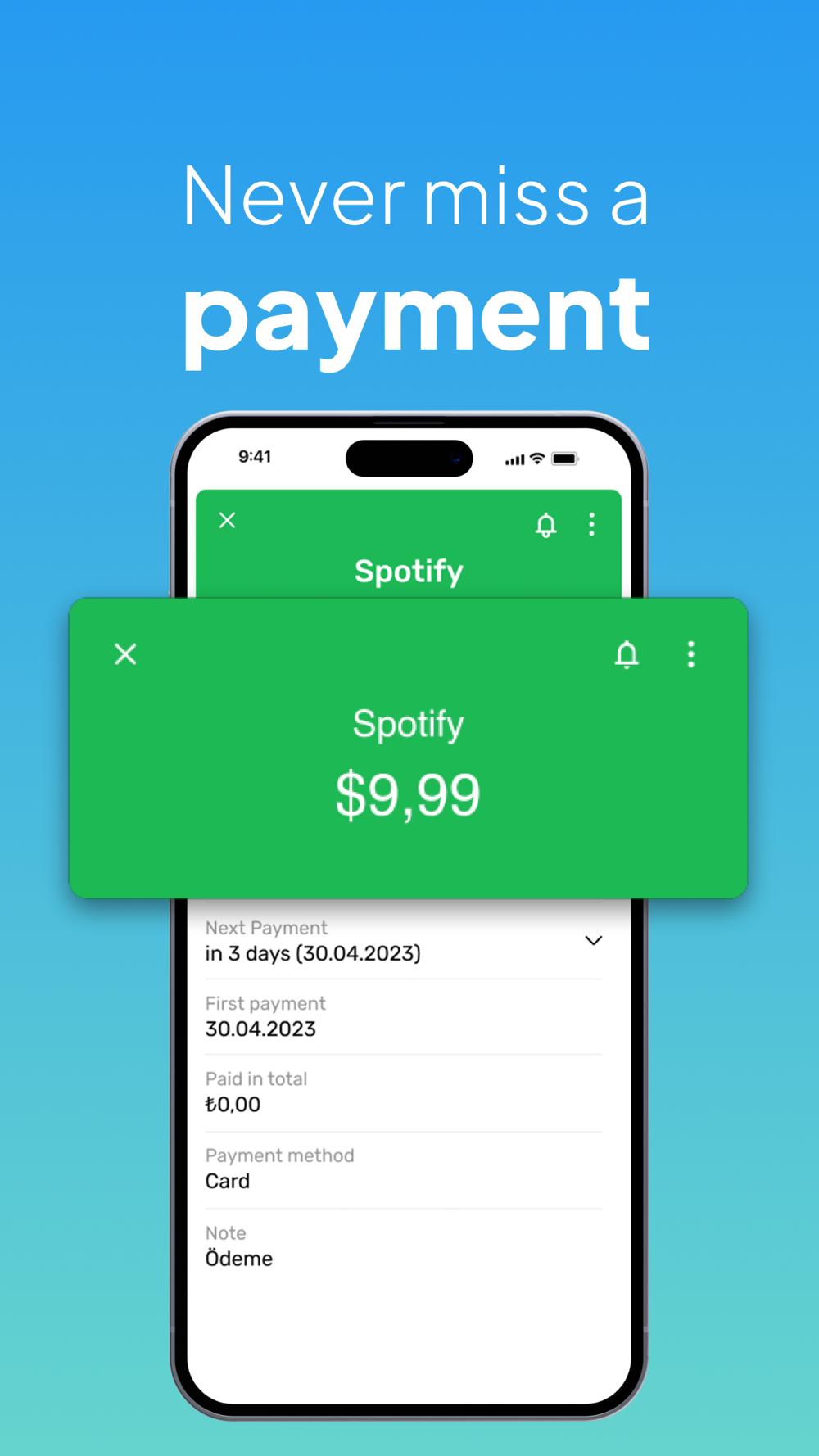 Subscription Manager reminds you of the amount and days you have to pay beforehand. So you don't miss any Subscription payments.
