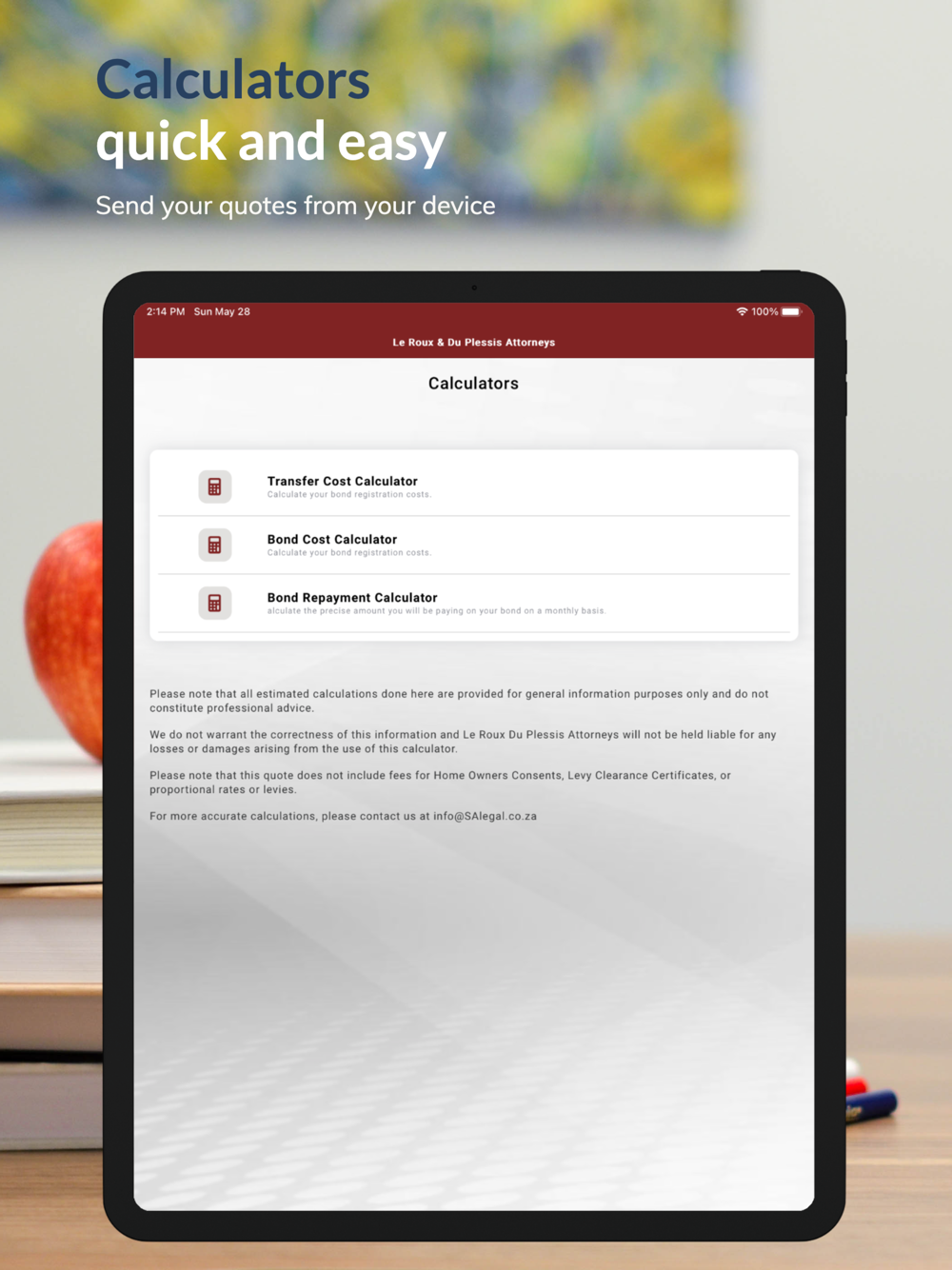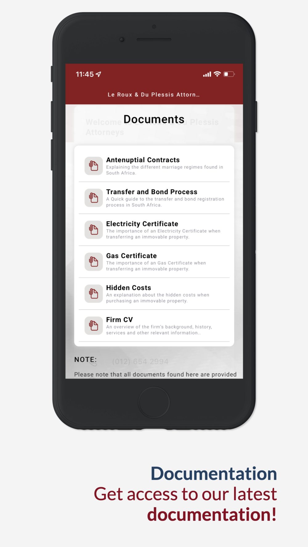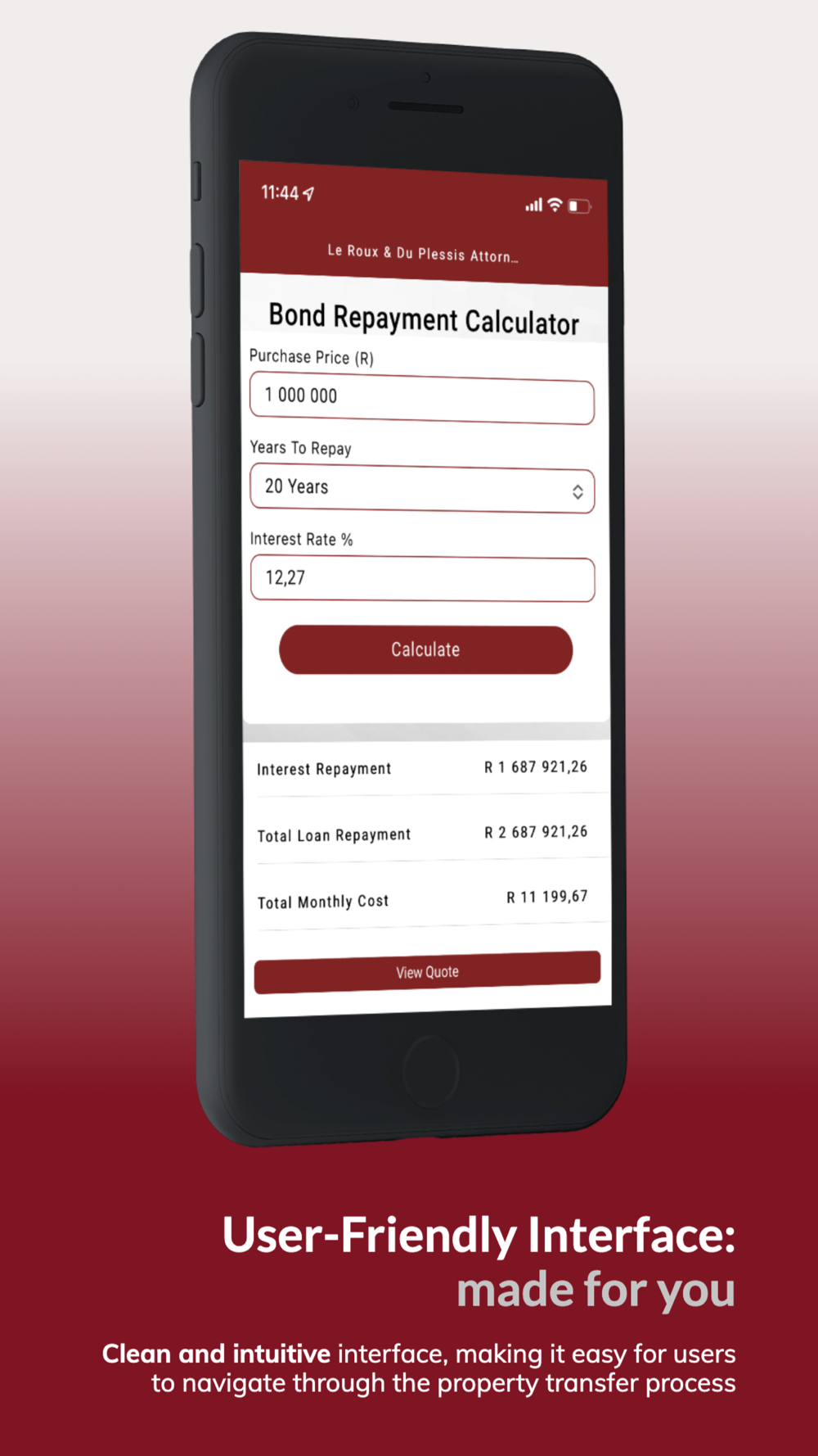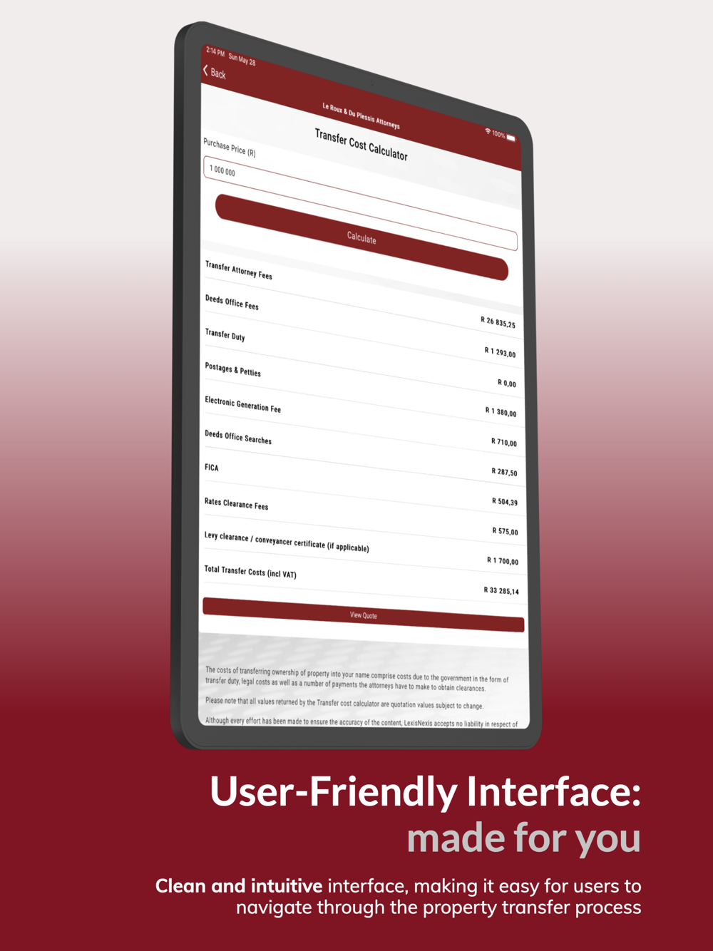 Le Roux Du Plessis Attorneys’ comprehensive mobile app is specifically designed to explain the process of transferring immovable properties in South Africa. It offers a user-friendly interface, detailed information on transfer & bond costs and a streamlined process to facilitate seamless property transactions.