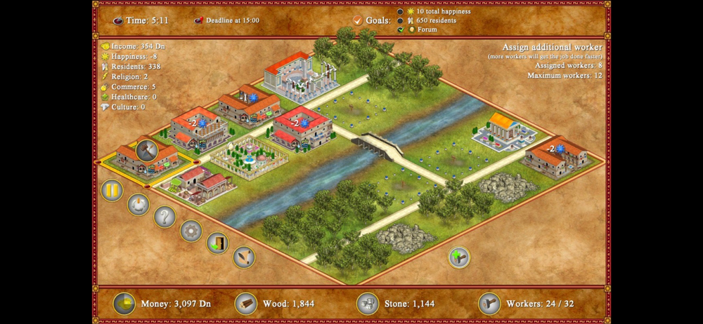 Enjoy this classic time management strategy game from the popular Townopolis-Romopolis-Megapolis series. Achieve various goals by building ancient Roman cities on a limited area with limited resources and in a limited time. But don't worry - you can pause the game at any time, or play casually without the time limit if you prefer.