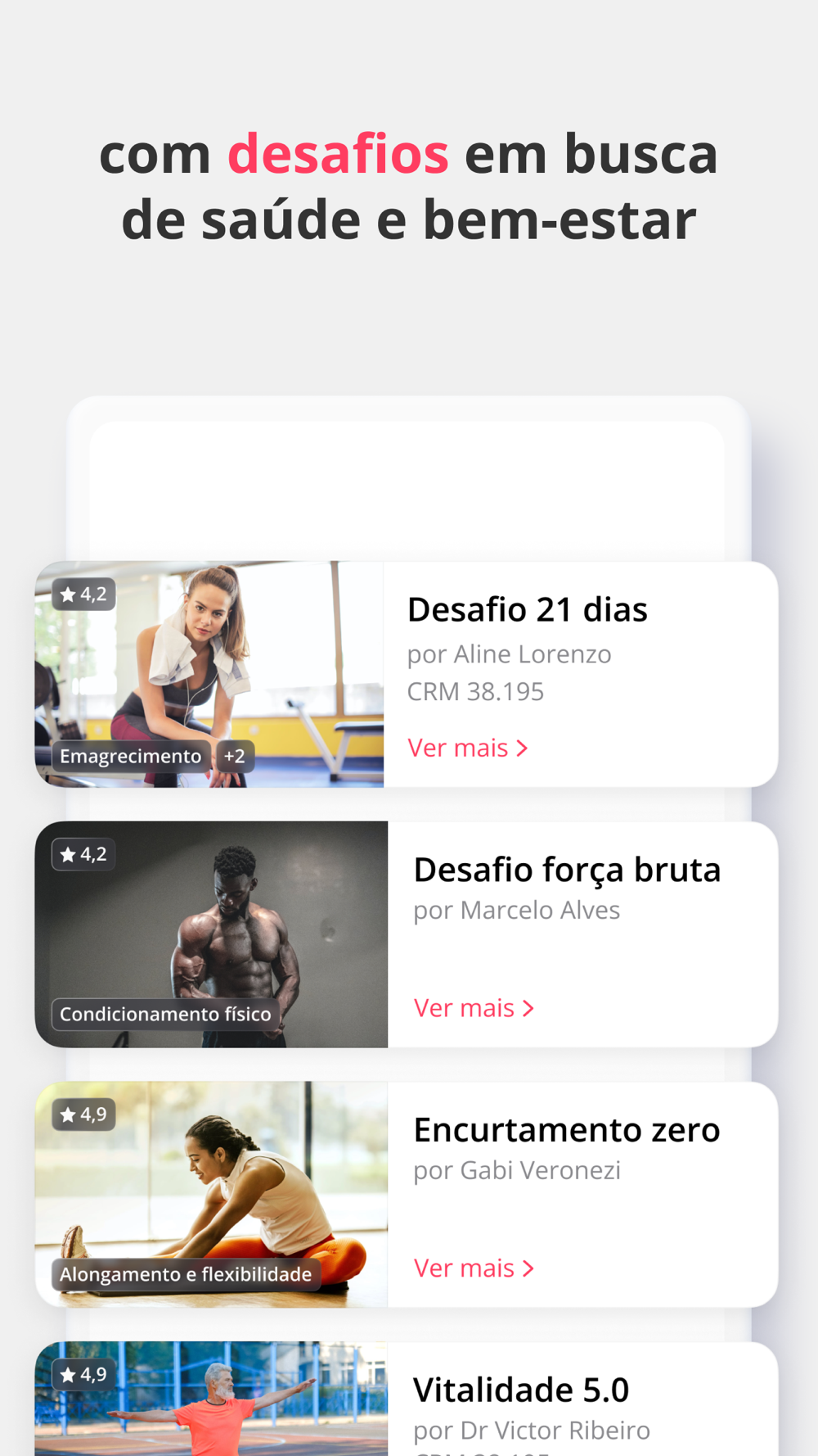 Junte-se a profissionais de saúde, criadores de conteúdo e referências em suas áreas em busca de propor desafios e atividades diárias que proporcionam uma nova forma de encarar a saúde e o corpo, sem a necessidade de diversas ferramentas diferentes.