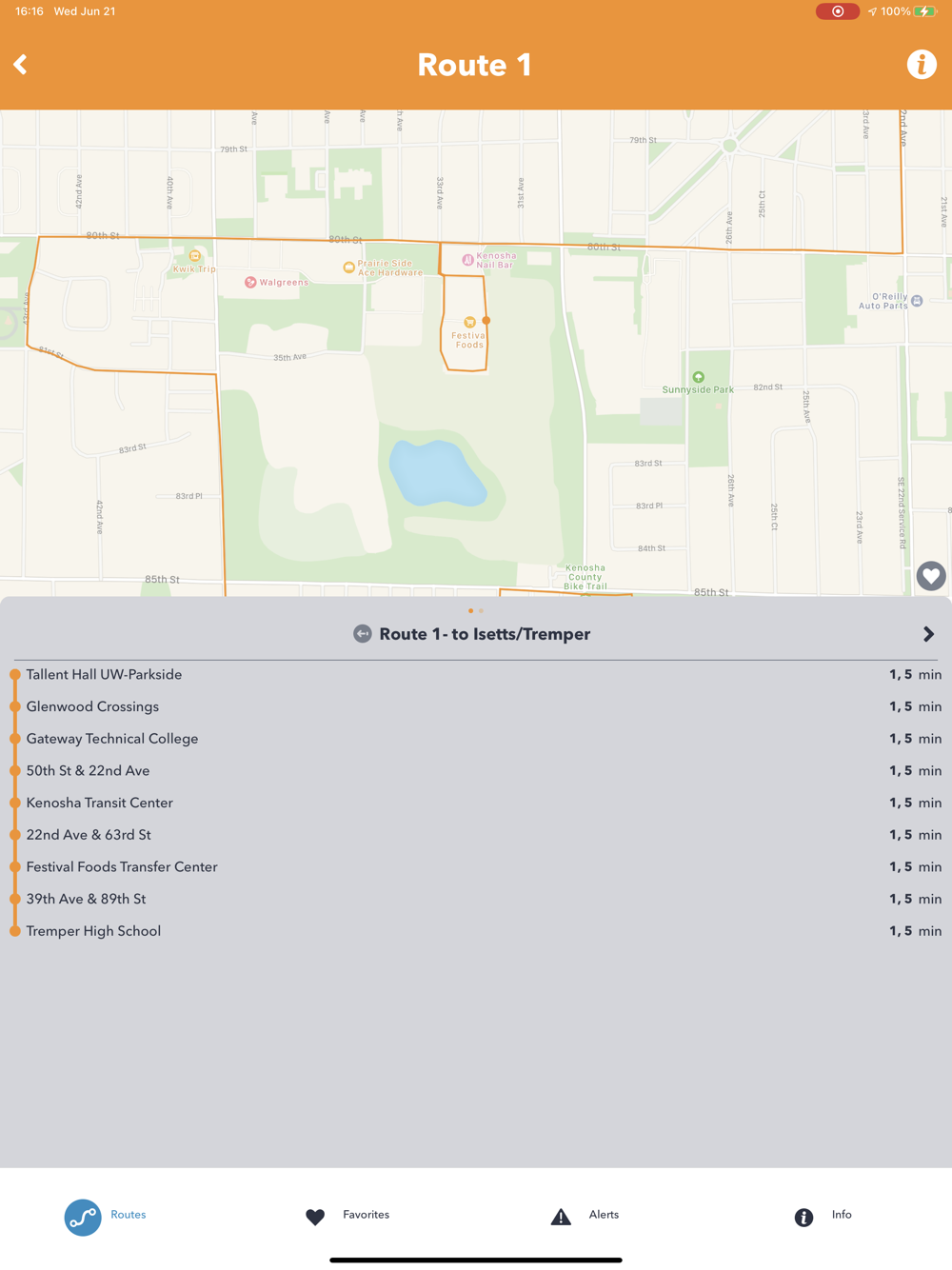 Provides real time tracking of Kenosha Area Transit buses serving the City of Kenosha and Village of Pleasant Prairie. Allows users to save favorite stops and create automatic reminders for bus arrival times. Displays up to the date announcements regarding service changes, weather delays, and other news.