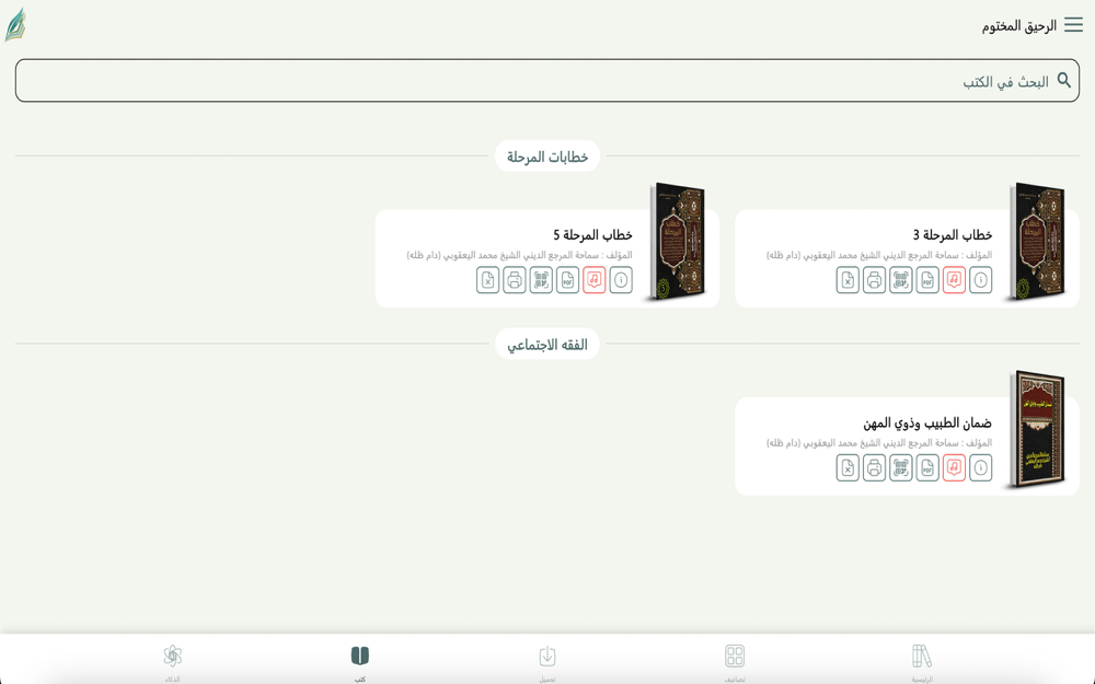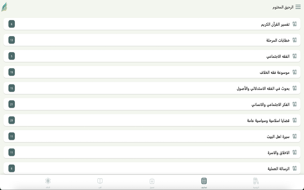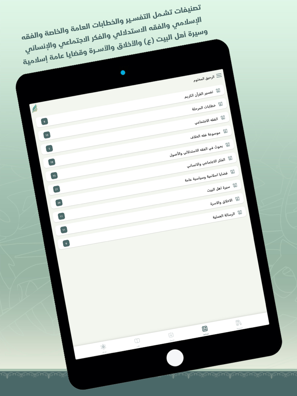 الرحيق المختوم .. مكتبة مختصة بمؤلفات سمــــاحة المـرجــع اليعقوبي (دام ظله) تحتوي على أكثـر مـن 100 مجلـد في مختلف فروع المعرفة بتصنيفات تشــمل التفســـير والخطـابات العامة والخاصة والفقه الإسلامي والفقه الاستدلالي والفكر الاجتماعي والإنساني وسيرة أهل البيت (ع) والأخلاق والأســــرة وقضايا عامة إسلامية. ينطلق سماحة المرجع الديني الشيخ محمد اليعقوبي (دام ظله) في البحث والتأليف والكتابة من الحاجة الفعلية لتقديم شيء ما أو تشخيص فراغ علمي أو فكري أو أخلاقي أو اجتماعي يجب تغطيته، ولا يرى في التأليف إضافة رقم الى الموجود في المكتبات، بل يساهم كل كتاب بإضافة شيء جديد في المعارف الدينية، ويحقق مصلحة للدين وللأمة وفق رؤية ثاقبة لمقتضيات المرحلة، لذا تنوعت مؤلفاته تبعاً لذلك فإنه مضافاً إلى بحوثه ومؤلفاته في التفسير والفقه والأصول والرجال واللغة والأدب والتاريخ فأنه ركز على قضايا كثيرة مثل (عالمية الإسلام وقدرته على قيادة البشرية، العقائد الحقّة، ولاية أهل البيت (عليهم السلام) وقيمومتهم، القضية الحسينية والفاطمية والمهدوية، ولاية الفقيه، الأخوّة الإسلامية، المنبر الحسيني، صلاة الجمعة، دور المسجد، مسؤوليات المرجعية، الاسرة والتربية والحياة الزوجية، الشخصية الإسلامية، الغزو الثقافي، استثمار الوقت، الاعلام، التنمية البشرية، التعايش السلمي، الحرب الناعمة، الصراع الحضاري مع الغرب، دولة الانسان والكرامة الإنسانية، المرأة، الشباب، طلب العلم، منظمات المجتمع المدني، الاقتصاد، الاجتماع، السياسة، اصلاح النظام العشائري، الظواهر المنحرفة)، ((هذا التنوع يكشف مدى عمق رسالة الدين الإسلامي العظيم ويحدد أبعادها وقدرتها على إيجاد الحلول لمختلف القضايا المعاصرة ومخاطبة العقول على مختلف مشاربها واتجاهاتها ، كما يعكس مساحة اهتمام المرجعية الرشيدة وطول باعها في ميادين العمل الإسلامي))، ((ولمّا كانت رعاية الأمة تتطلب تغطية كل جوانبها الحياتية ومتابعة متغيراتها حرص سماحة الشيخ اليعقوبي (دام ظله) على تقديم المعالجات والحلول للمشاكل التي تعترض طريق بناء المجتمع السليم وتوفير الحياة الكريمة فصدرت البيانات والمحاضرات والكتب في التربية والأخلاق والاجتماع والتاريخ والاقتصاد والسياسة وغيرها ، وقد كان قبل ذلك وبعده بحوث الخارج الاستدلالية)).