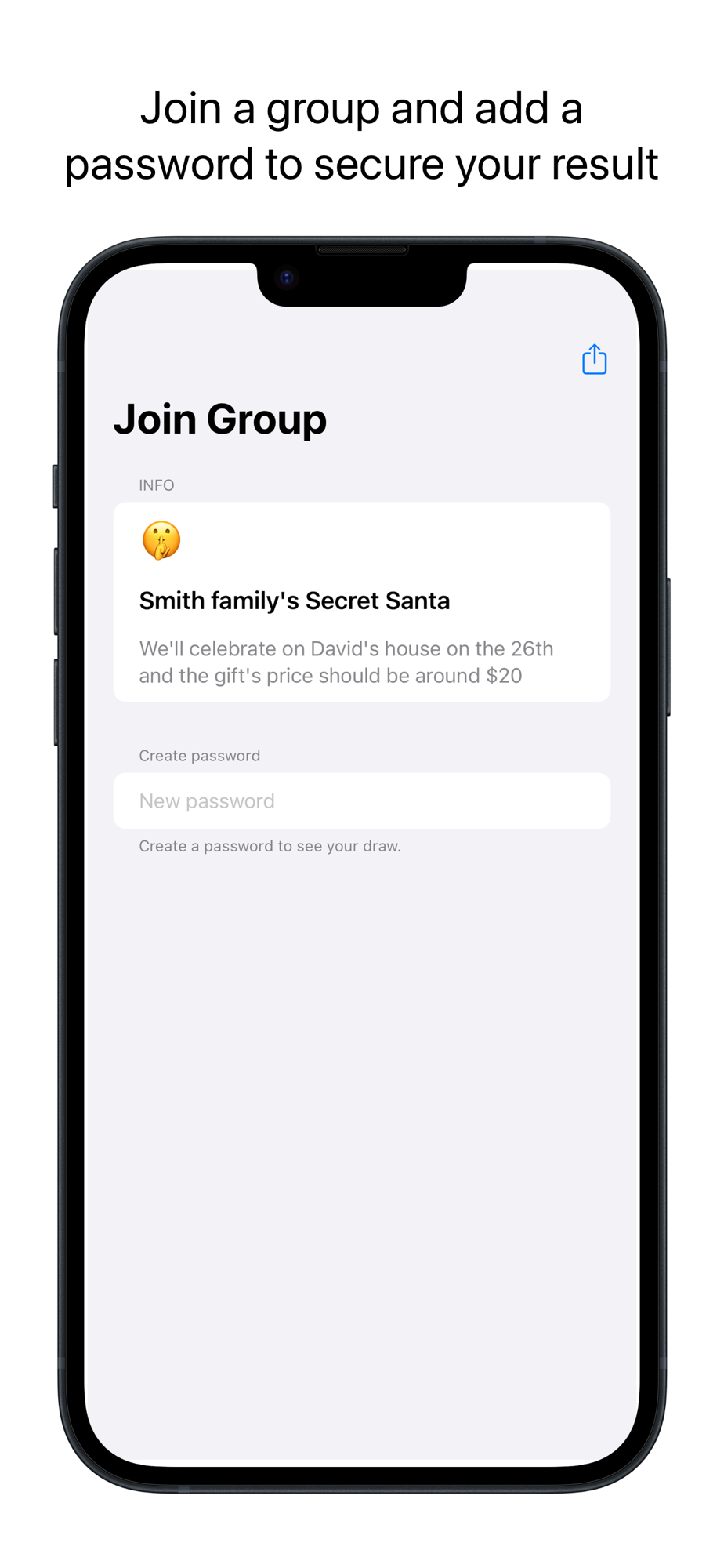 Create your Secret Santa group in seconds, then you can share a link for other participants to join. It's not possible to find out someone else's drawing because each participant can protect its drawing with a password.