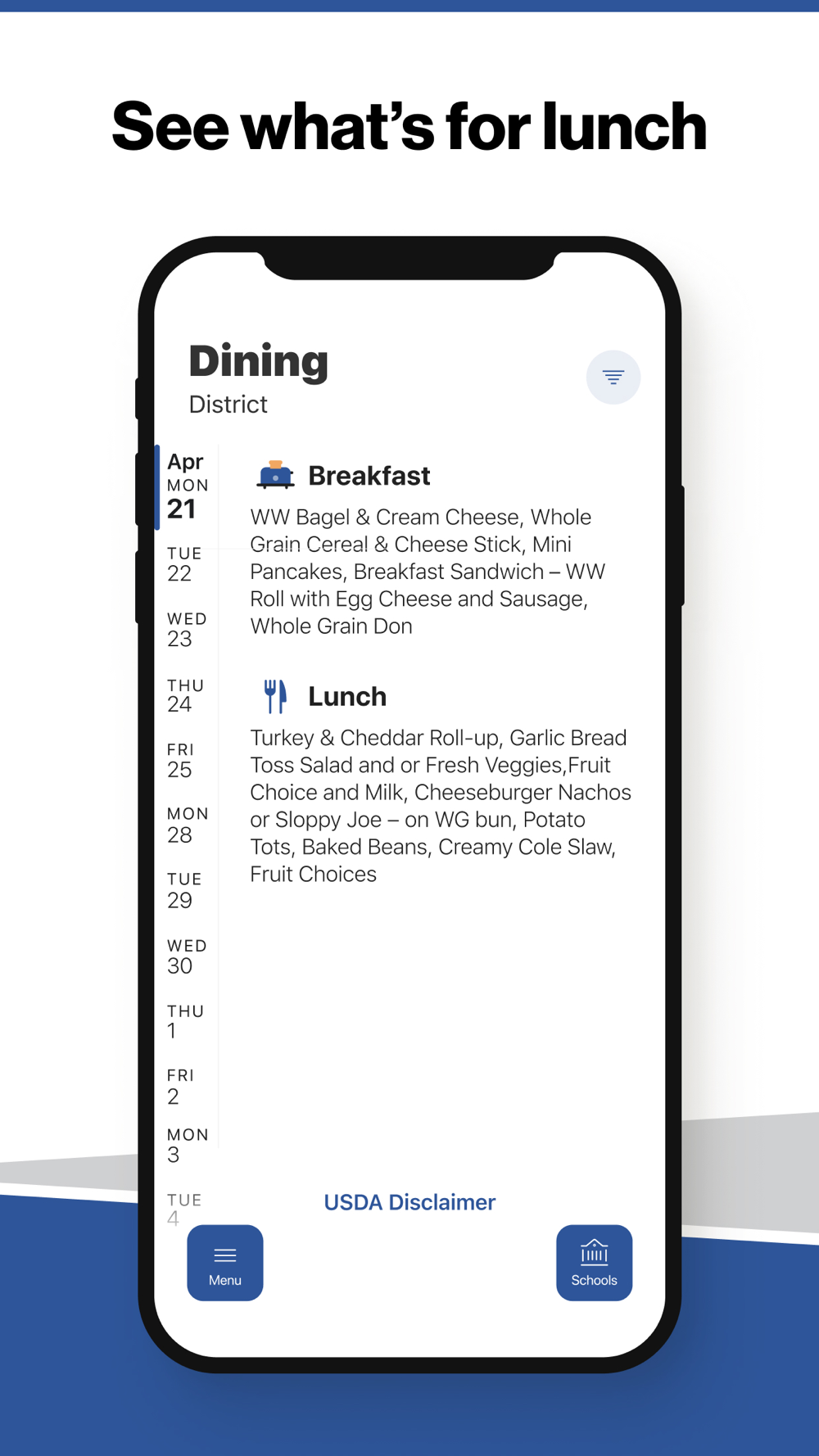 Within the dining section, you'll find an easy to navigate, weekly menu, sorted by day and meal type.