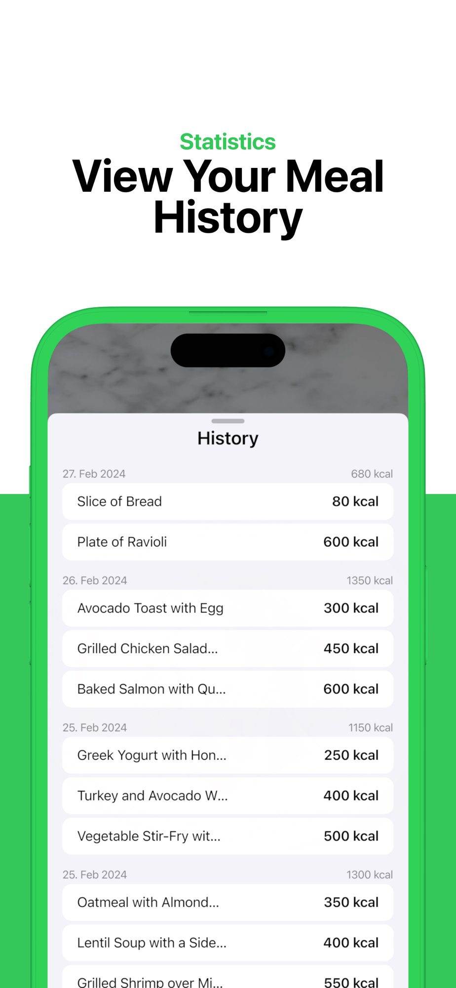 - Meal History and Tracking: Easily keep track of your meals and monitor your calorie intake over time.
