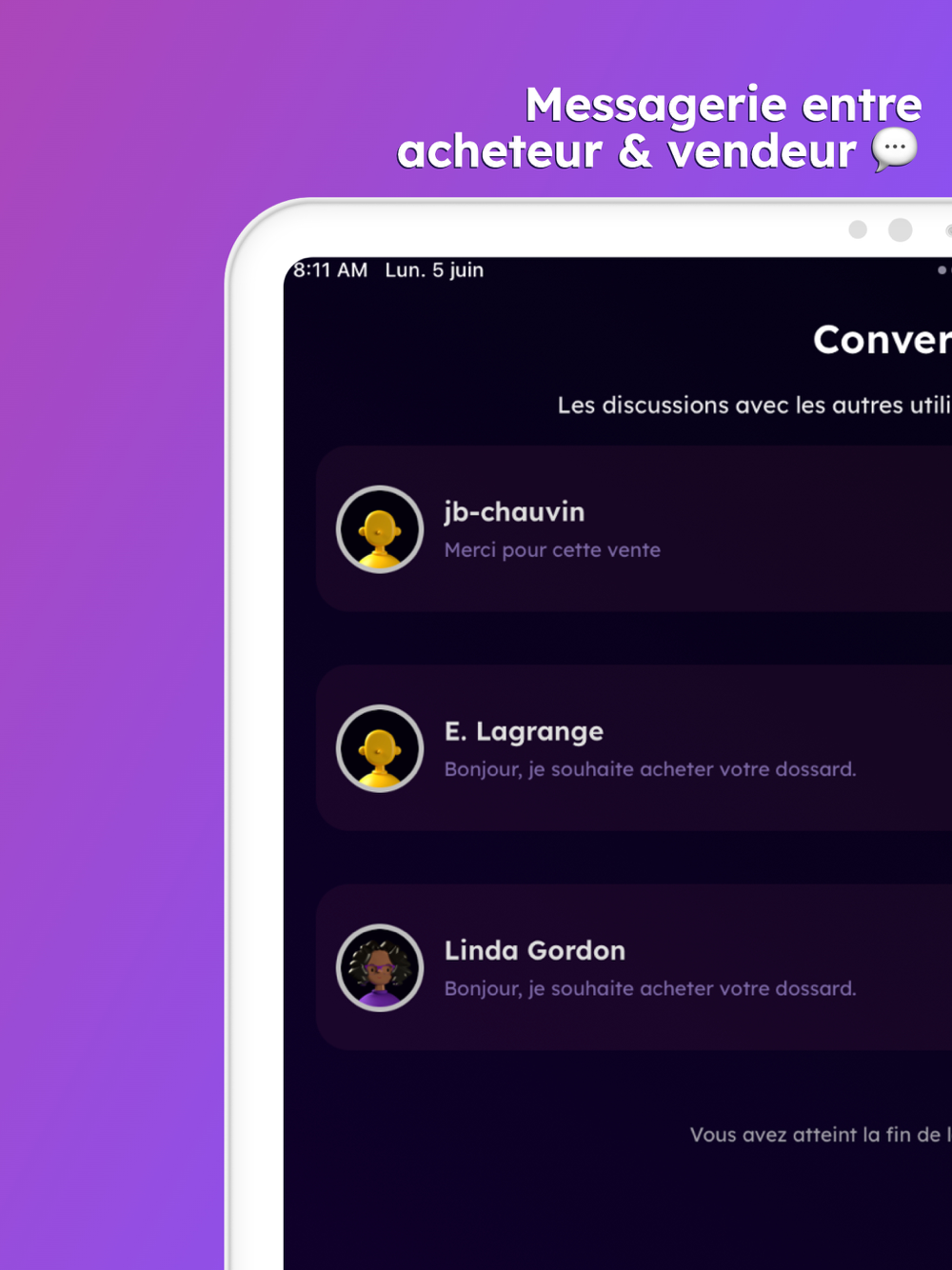 La messagerie intégrée de Runintwo facilite la communication entre les acheteurs et les vendeurs. Vous pouvez discuter des détails, poser des questions et finaliser les arrangements en toute transparence. La sécurité est notre priorité, et nous travaillons constamment pour améliorer l'expérience de nos utilisateurs. Des fonctionnalités telles que l'échange sécurisé, avec un système de paiement intégré, seront bientôt disponibles pour garantir des transactions sans souci.