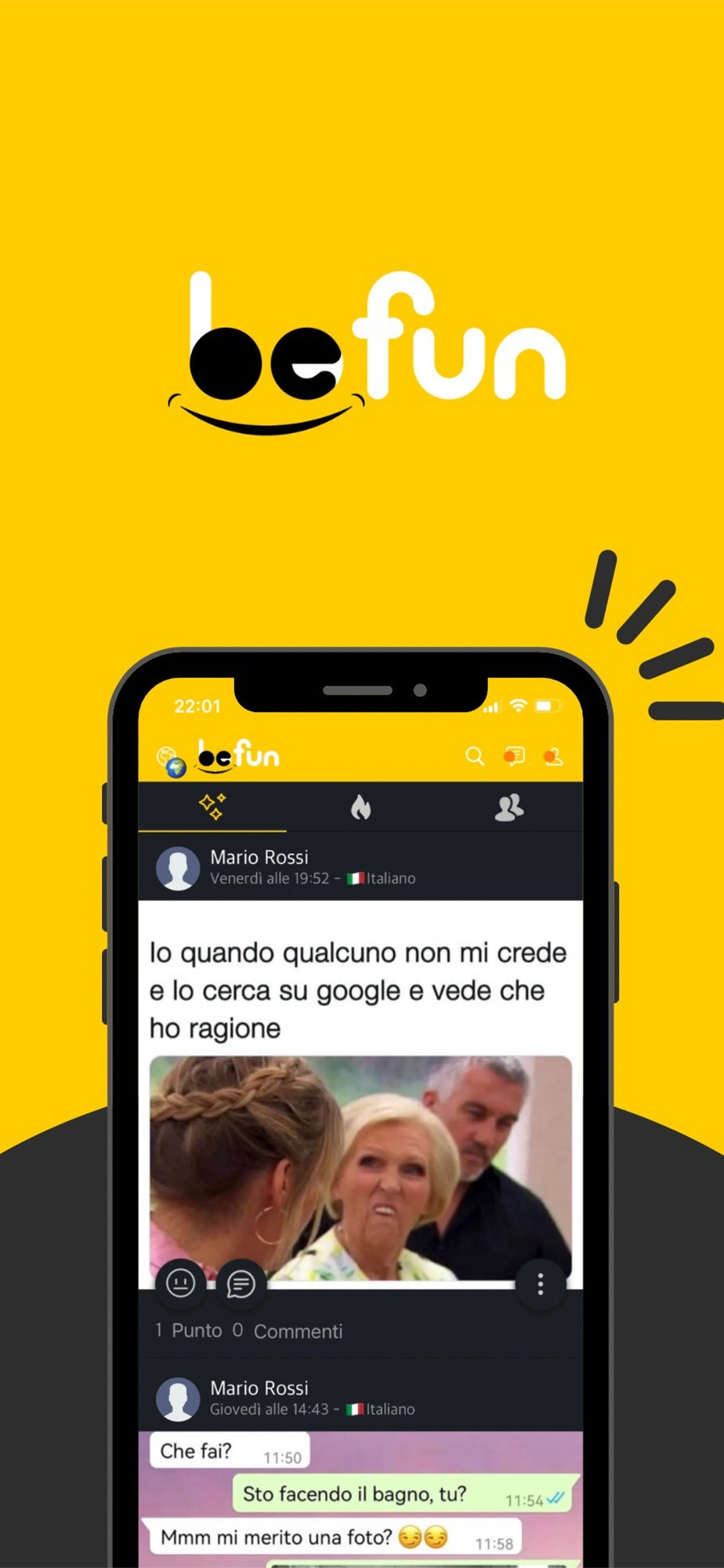 Stop stressing out with your daily life, download Befun. Funny videos, memes, ironic posts and lots of friends to spend time with. Create your profile, share your posts, your memes and your funny videos, maybe you will become famous with us, or you will simply have a laugh with us.