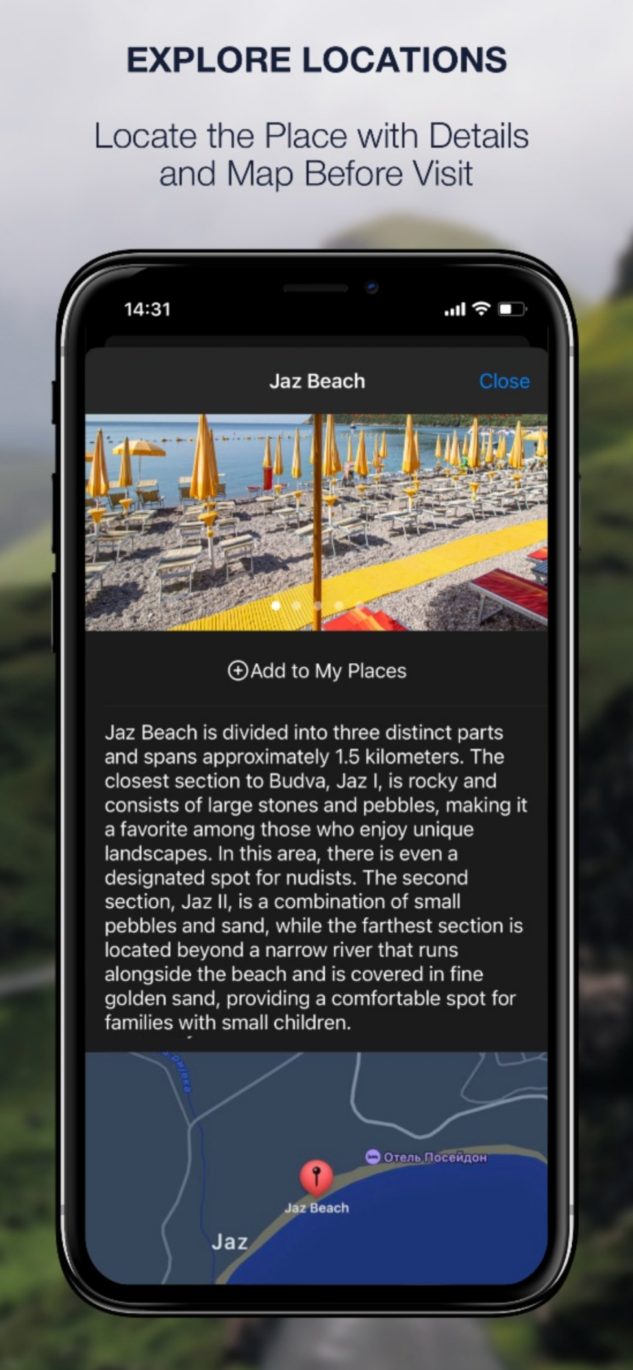 Montenegro Travel: tips&tricks offers a unique feature called "MY PLACES," allowing you to curate your own collection of favorite spots. Whether it's an enchanting historical site, a picturesque viewpoint, a convenient grocery store, or a rejuvenating beauty salon, you can save them all within the app. Access your saved places anytime, view their descriptions, and effortlessly navigate to them using integrated Apple and Google Maps.