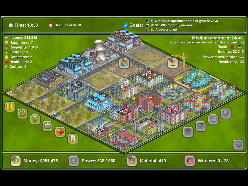 Enjoy this classic and simple time management simulation game from the popular Townopolis-Romopolis-Megapolis series. Achieve various goals by building functional city zones on a limited area with limited resources and in a limited time. But don't worry - you can pause the game at any time, or play casually without the time limit if you prefer.