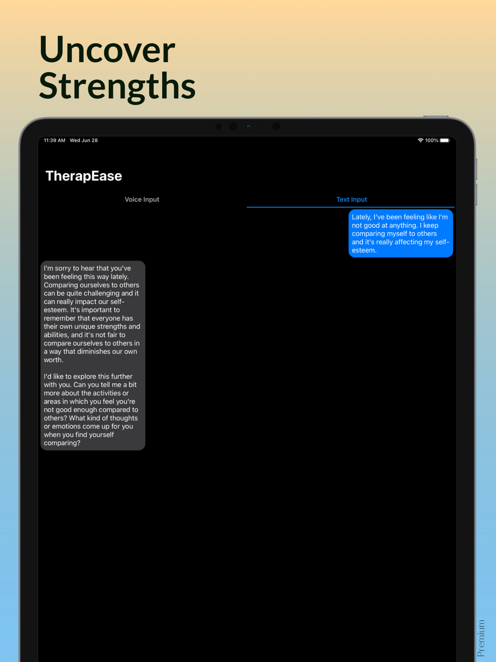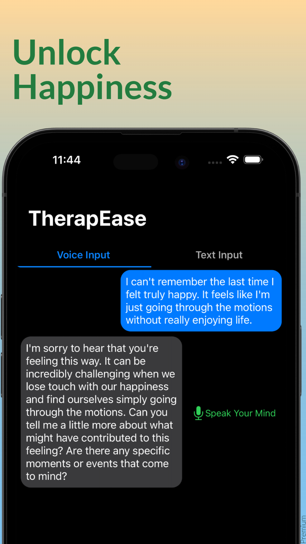 TherapEase is more than just an app—it's a companion. By employing advanced AI technology, TherapEase provides personalized and confidential therapy experiences. Your AI therapist understands and empathizes, offering you insightful advice, both in written and spoken forms.