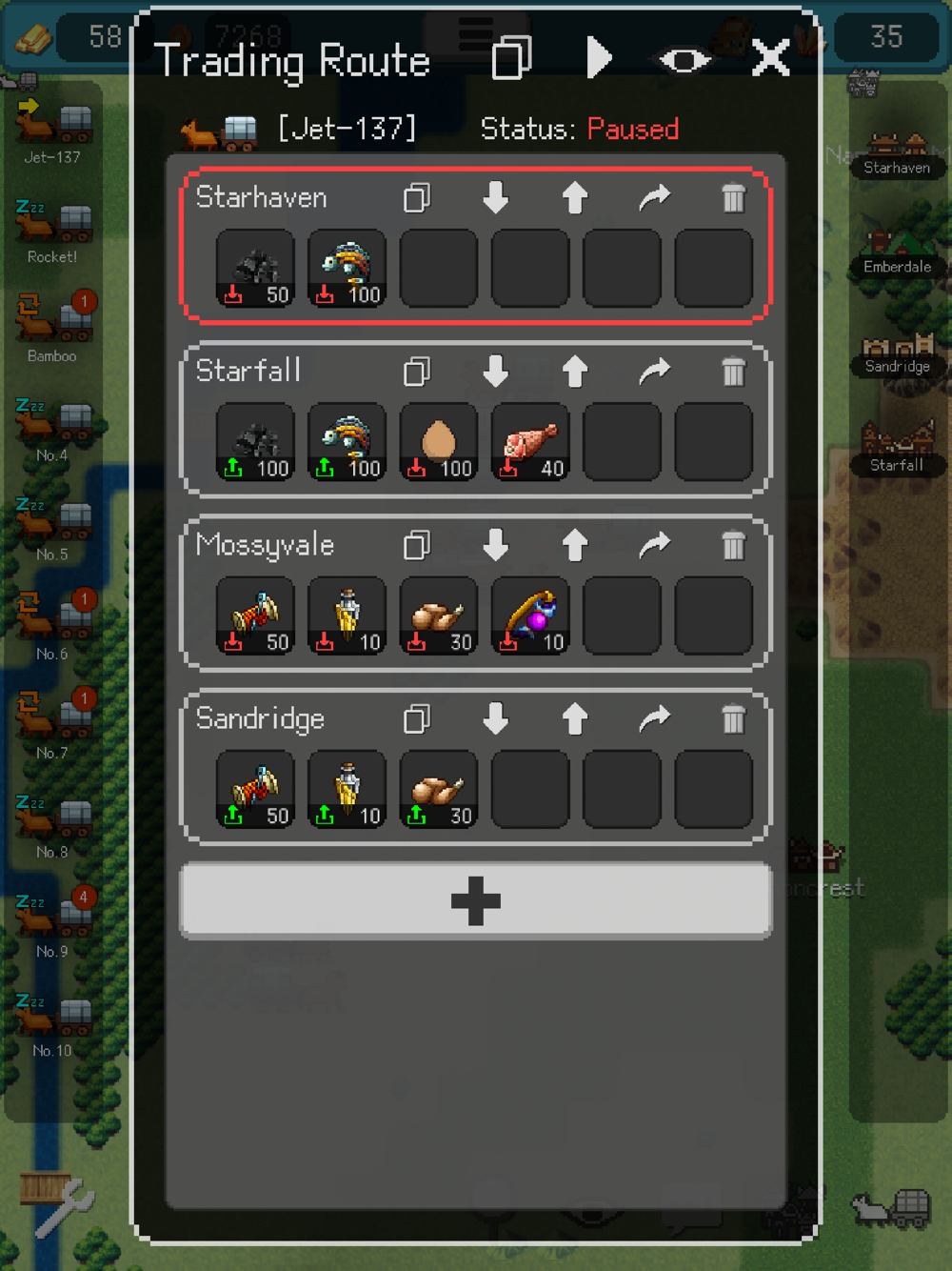The price of each type of goods will be different in different villages, so you have to find out the trading route which can get the best profit and arrange the caravan to go to trade automatically. This way you can earn more money faster!